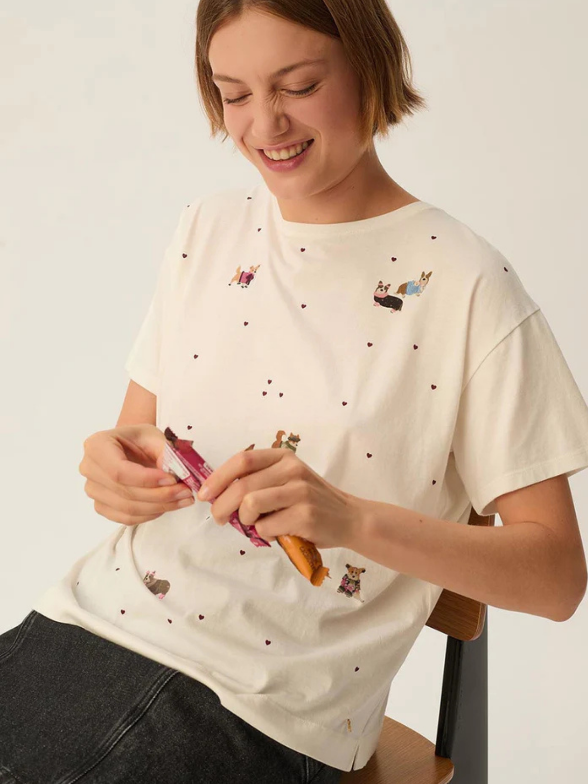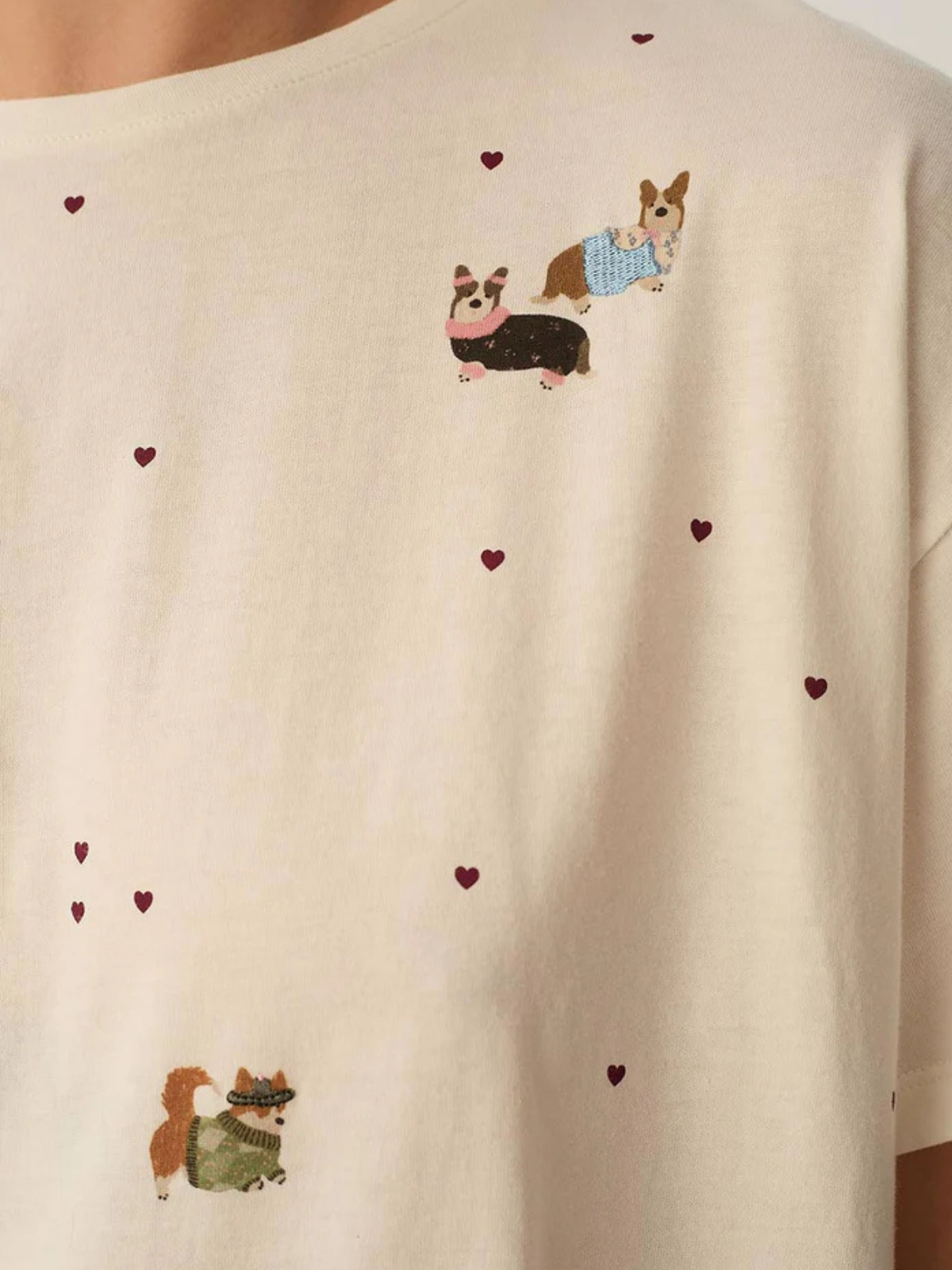 White t-shirt with corgi dogs embroidered all over the front.