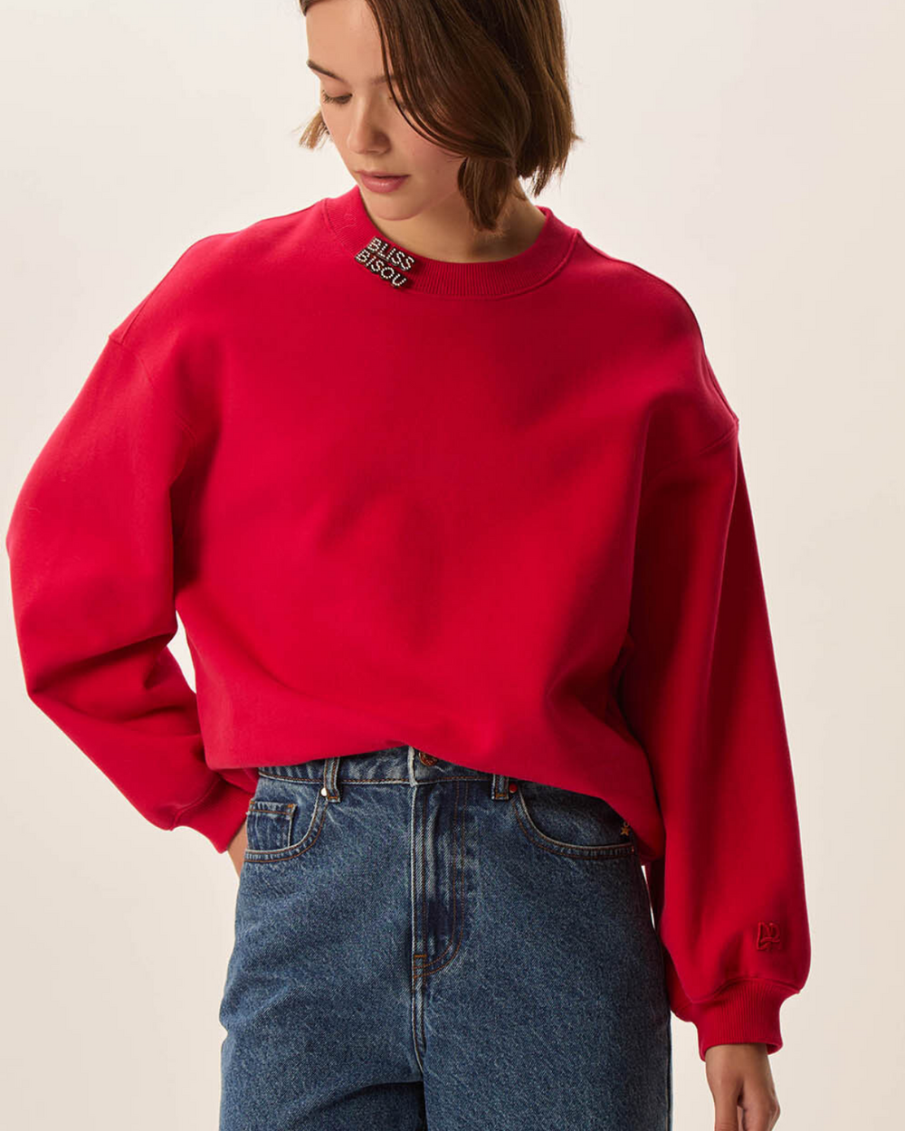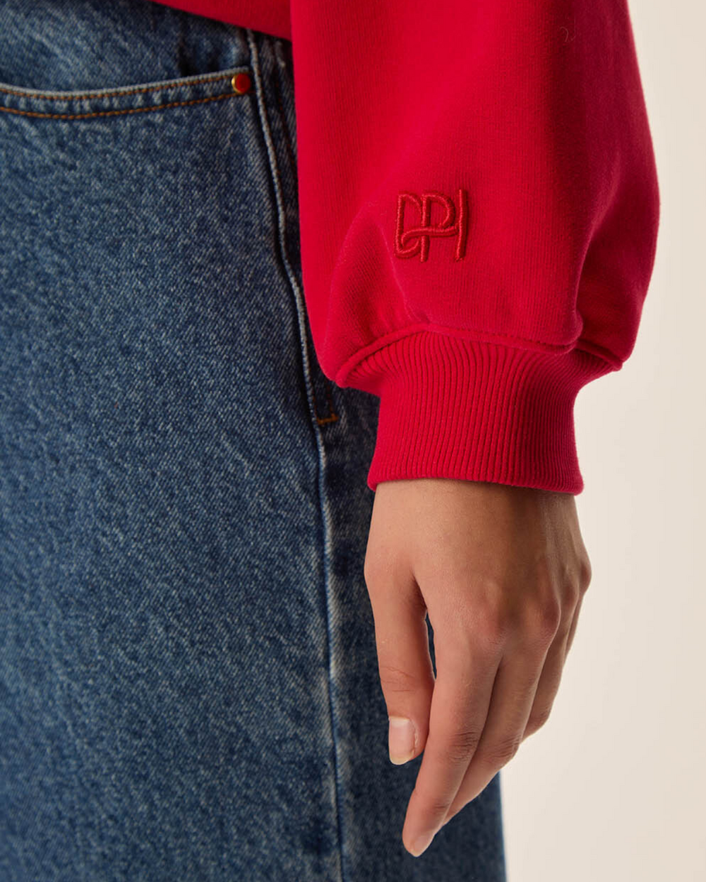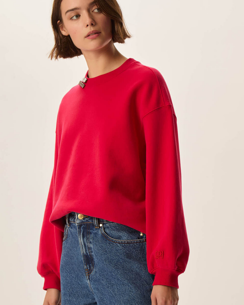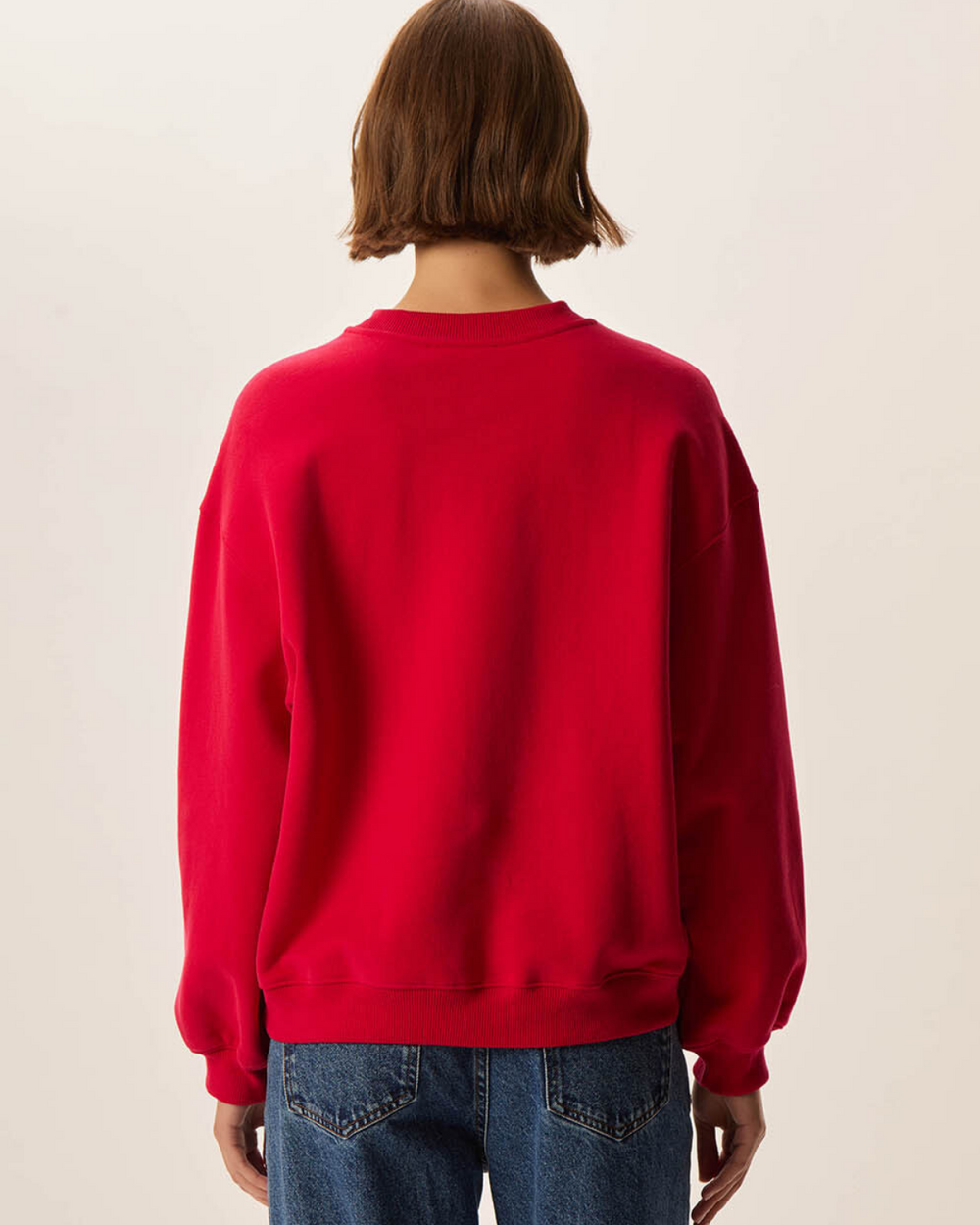 Relaxed crewneck sweater in charming red. Pin sold separately.