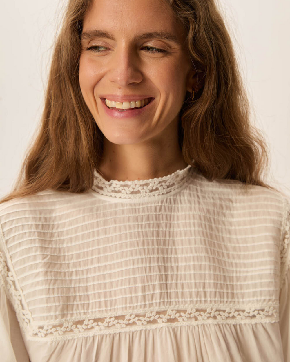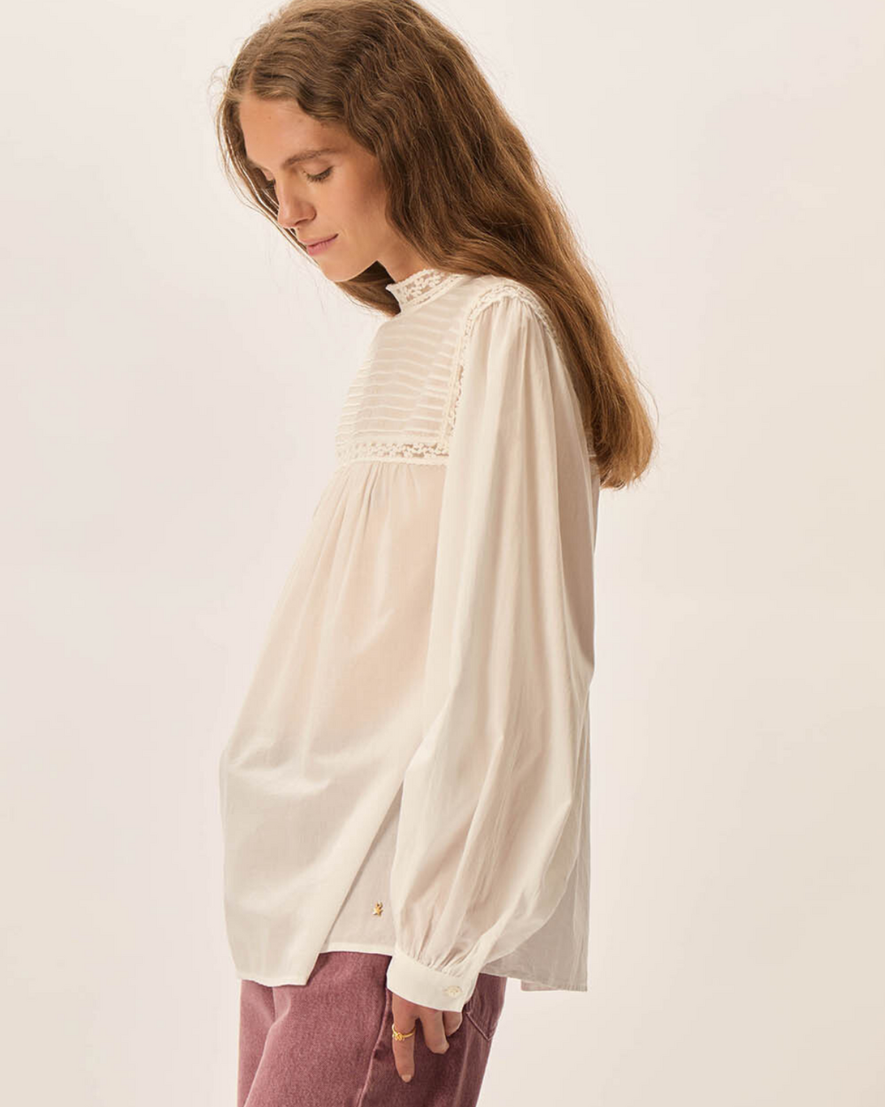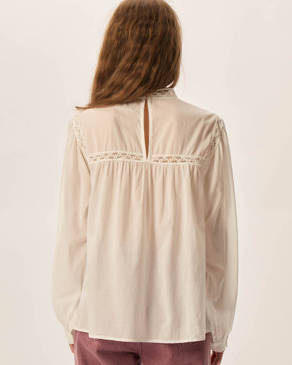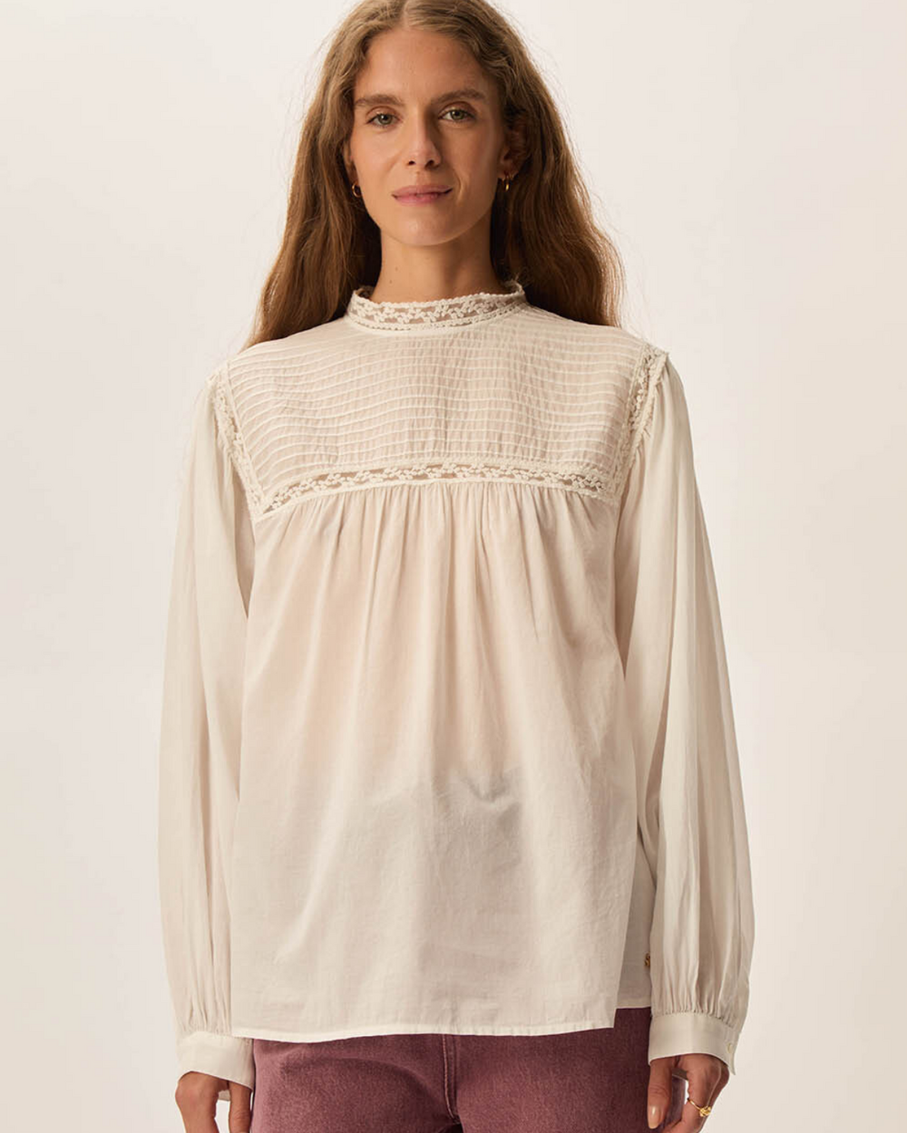 Mock neck blouse with lace details on the front and cuff.