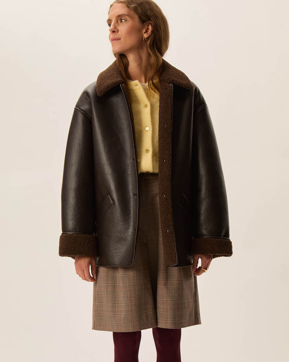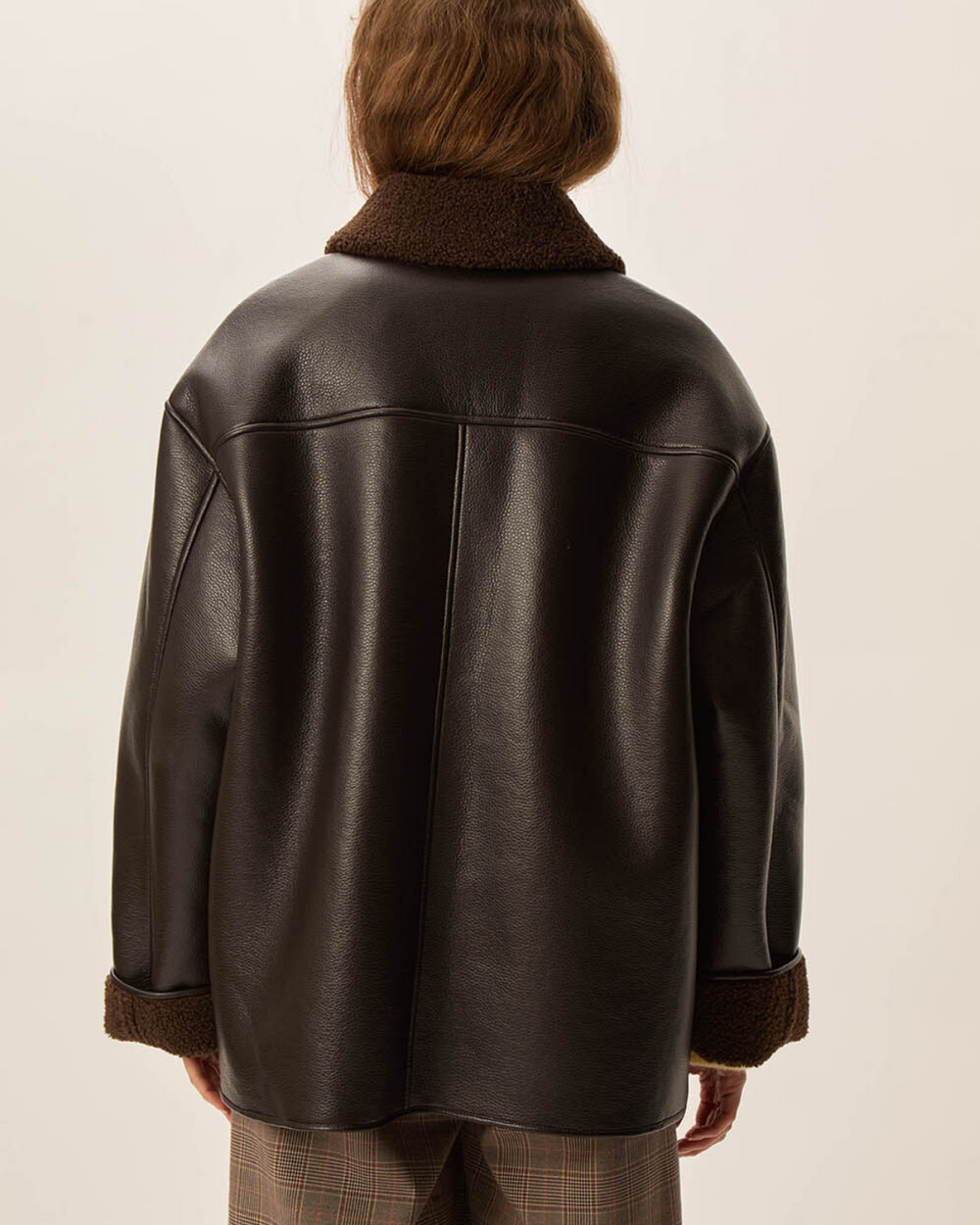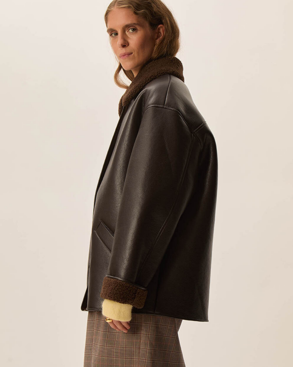 Outerwear jacket with sherling lining.