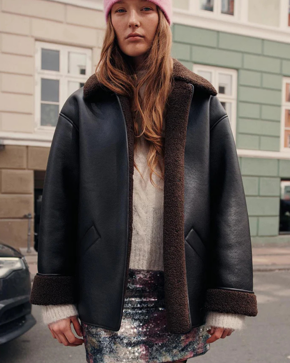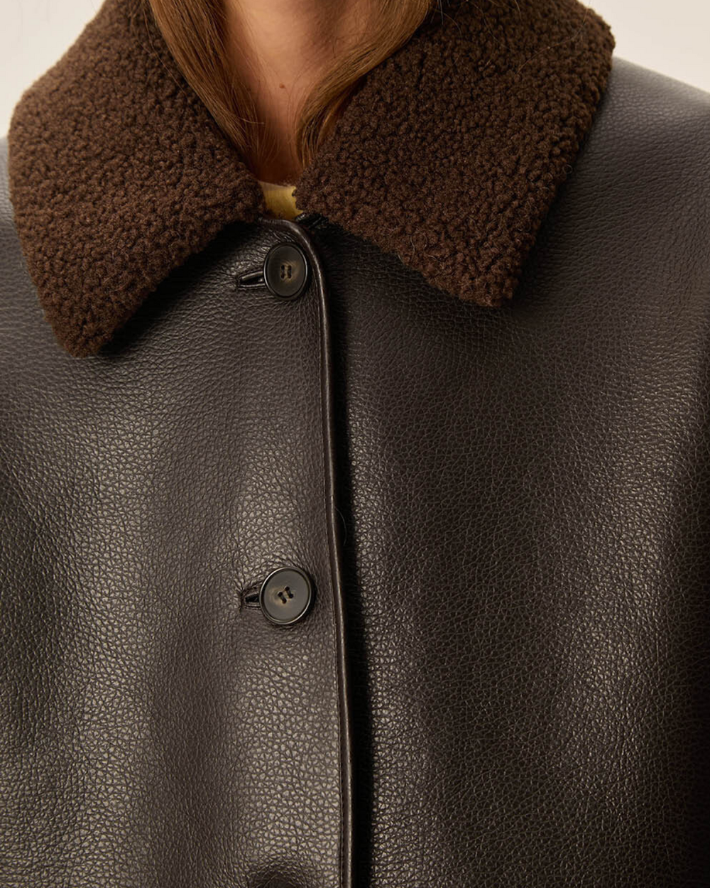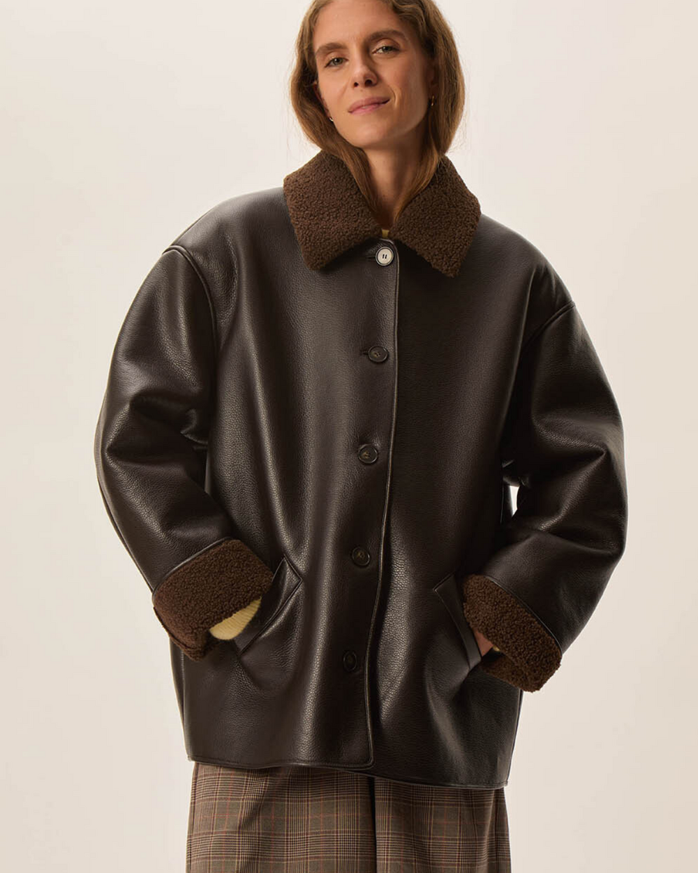 Outerwear jacket with sherling lining.