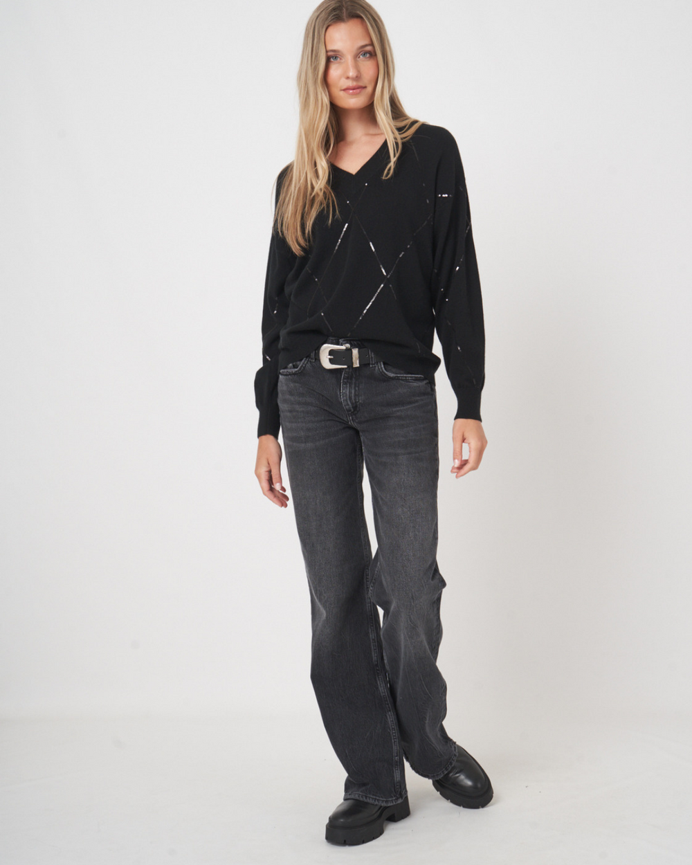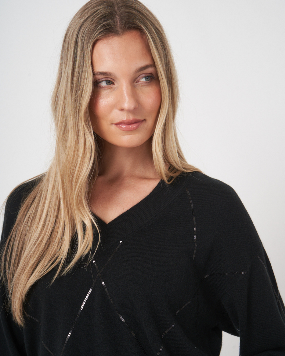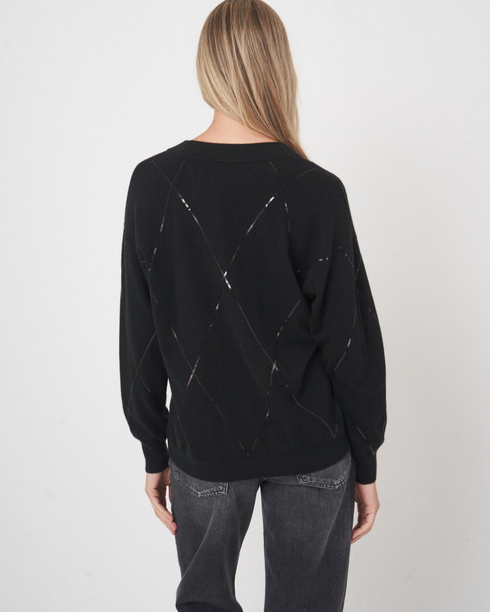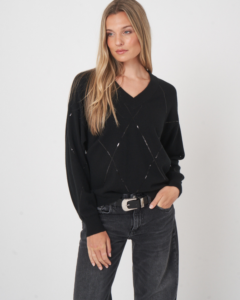 Long sleeve v-neck drop sholder sweater with all over sequin harlequin pattern.