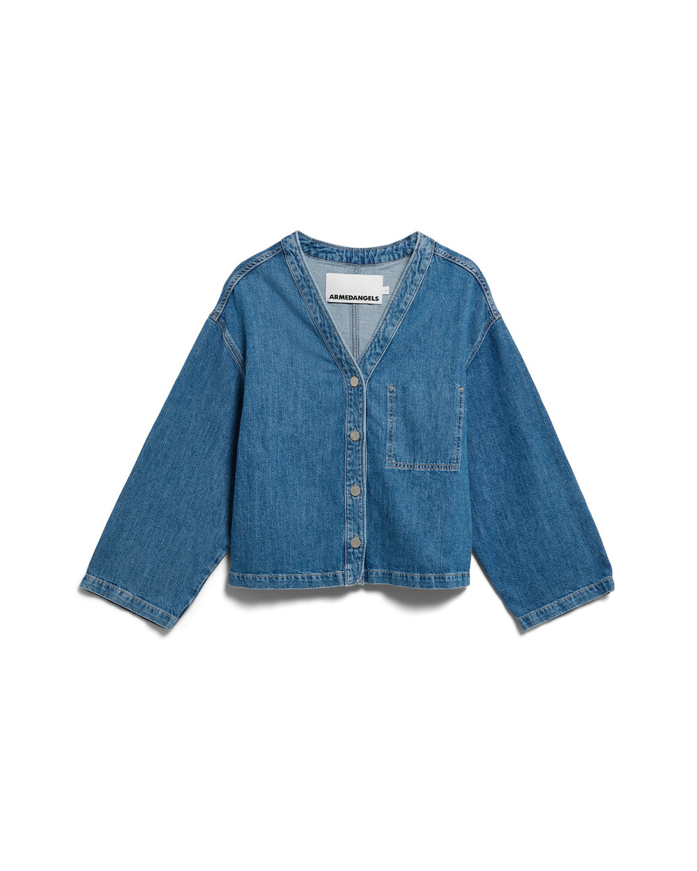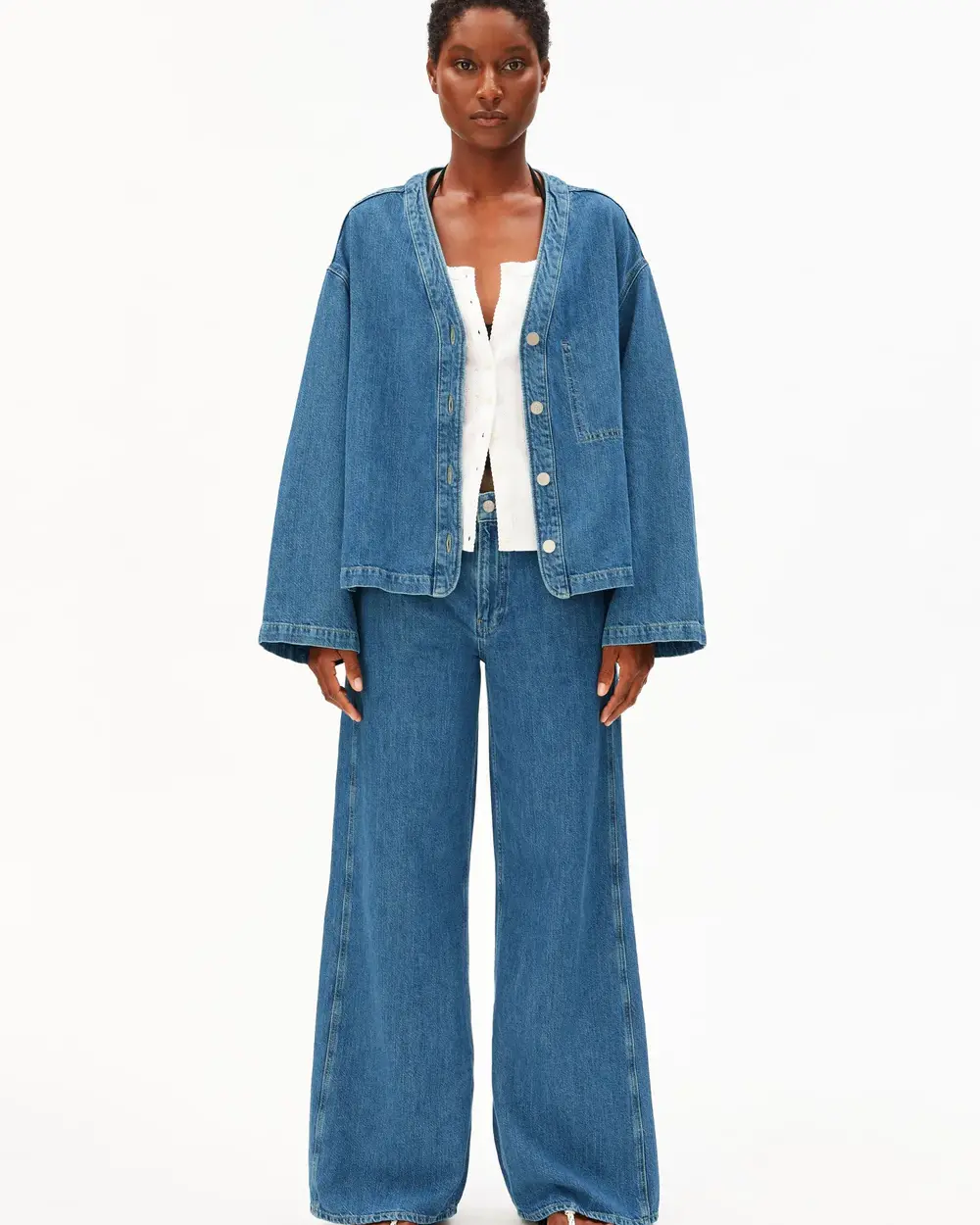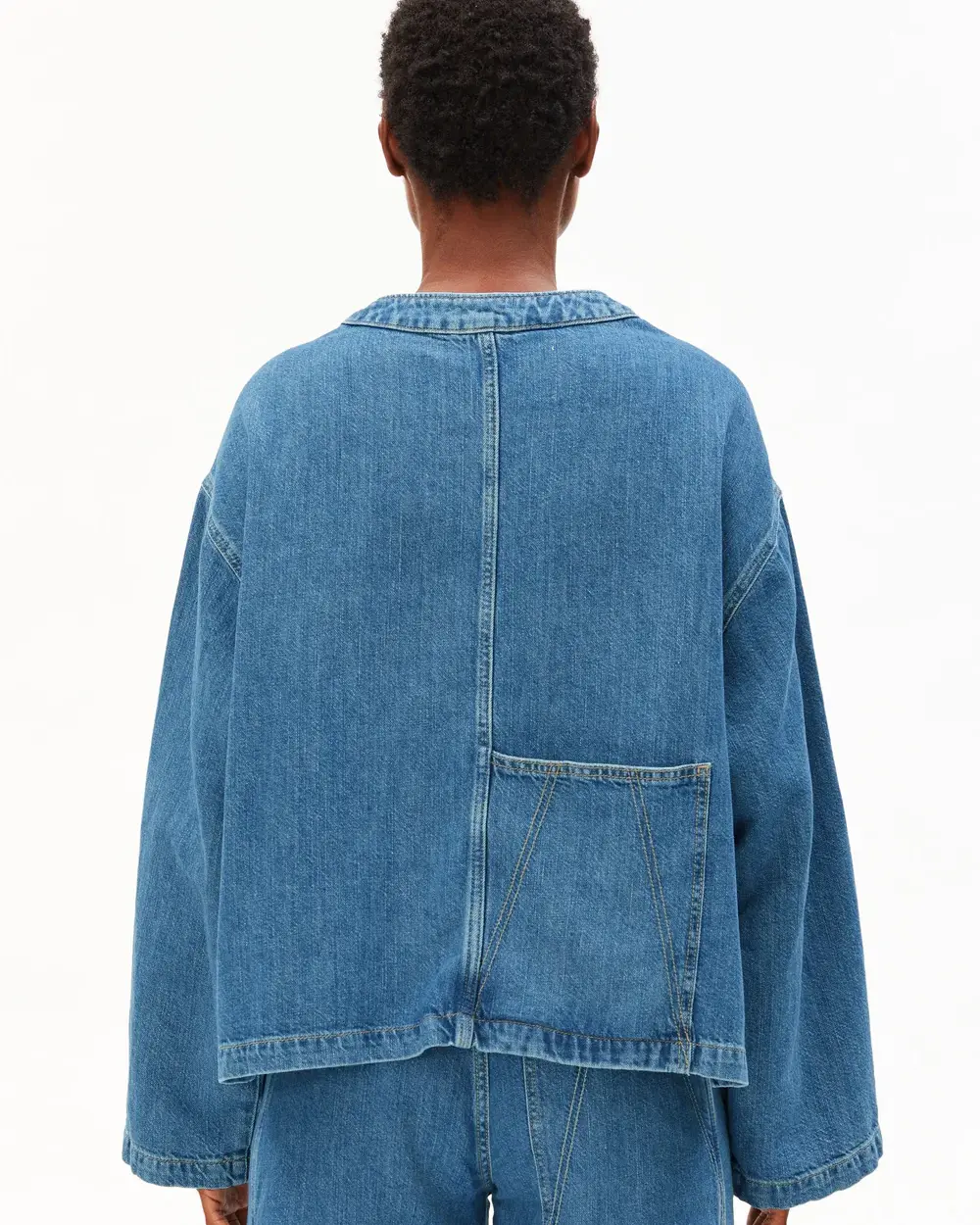 Linen blend denim jacket with no colla. Details include faux pocket on the front and real pocket on the back.