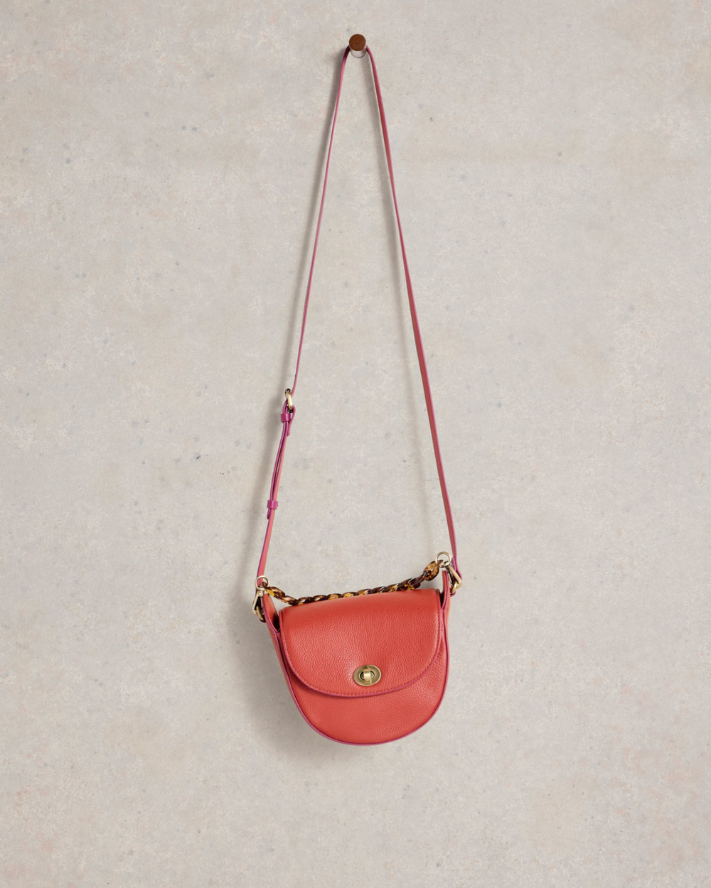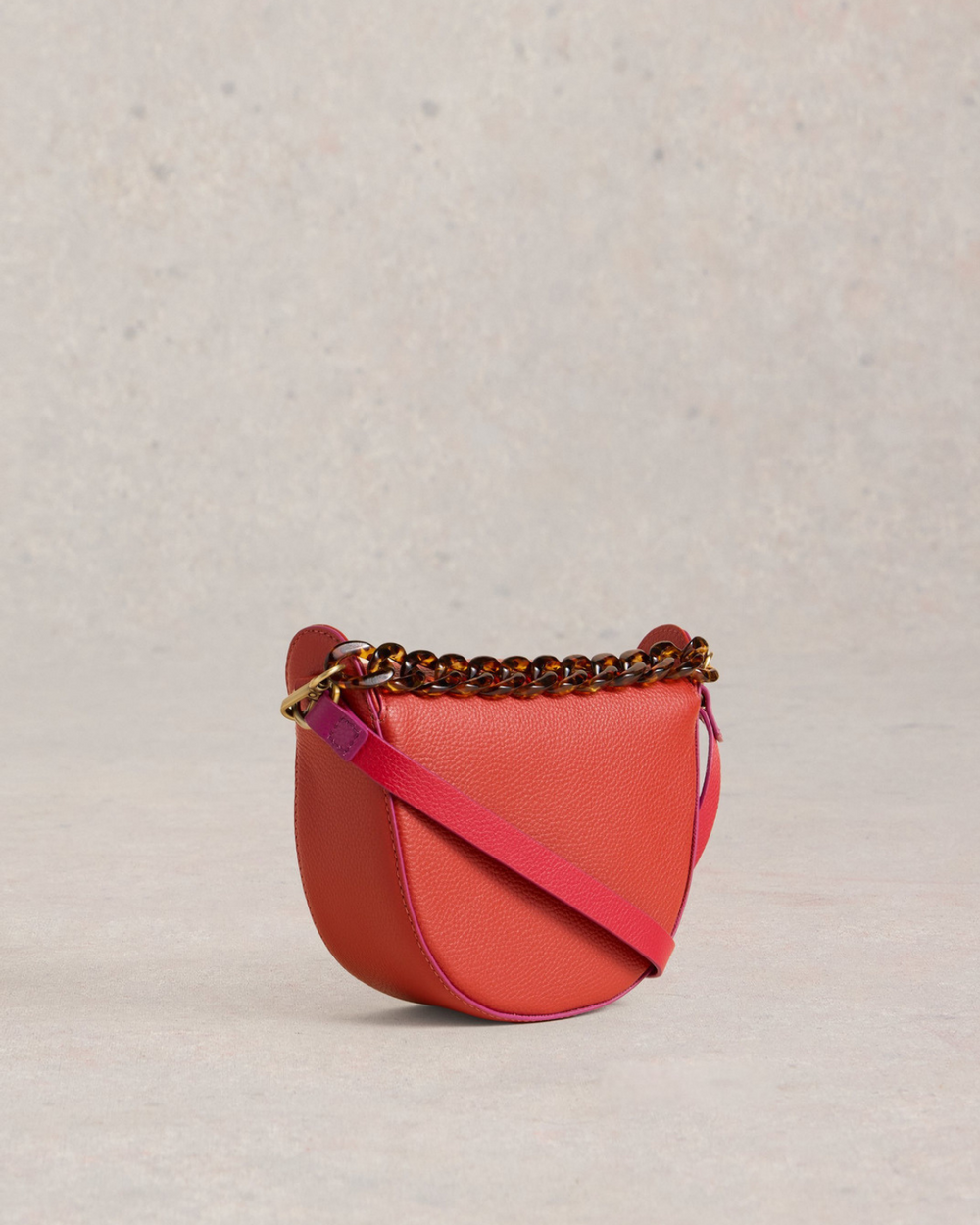 Leather satchel with two-tone straps and an extra small plastic chain strap.