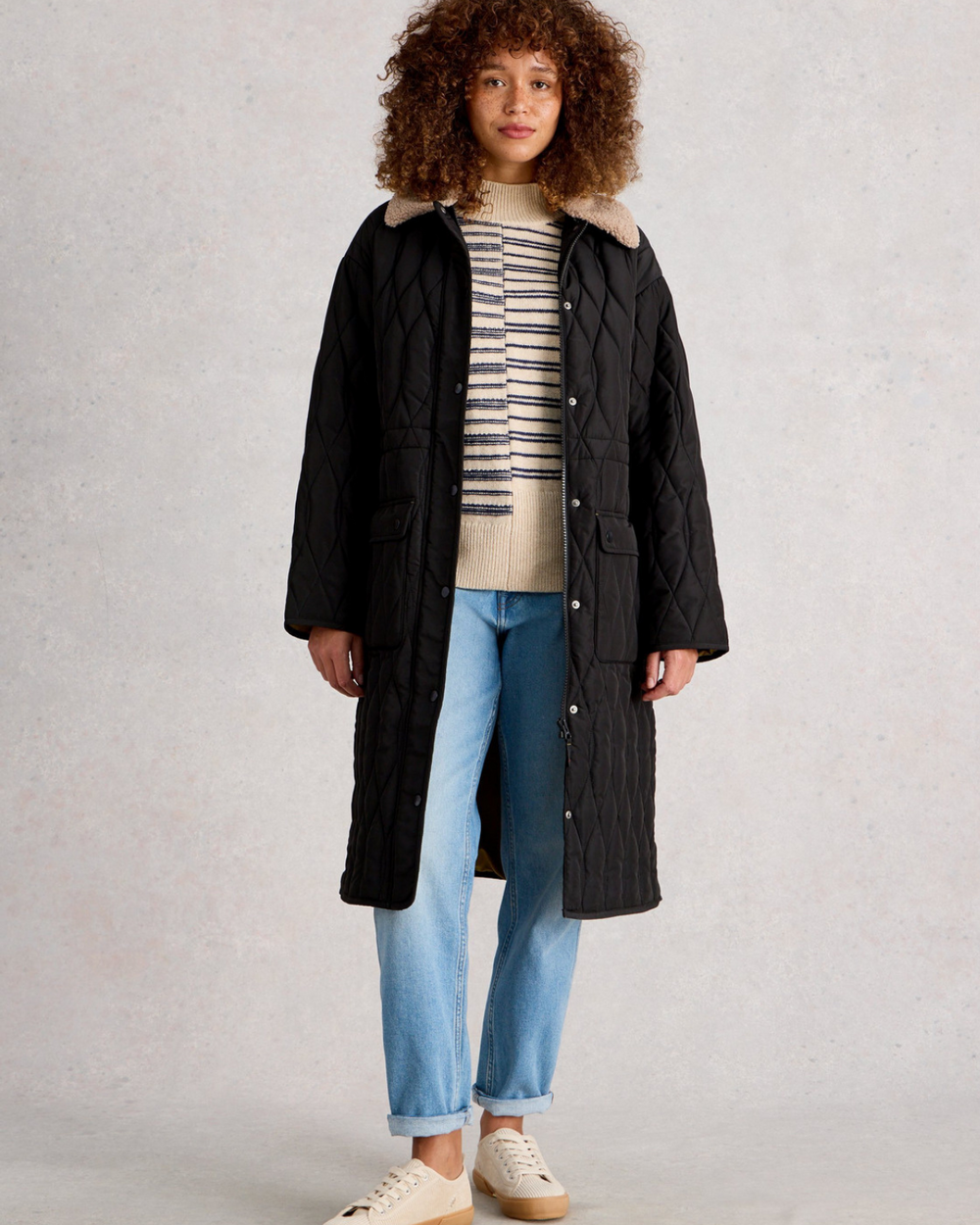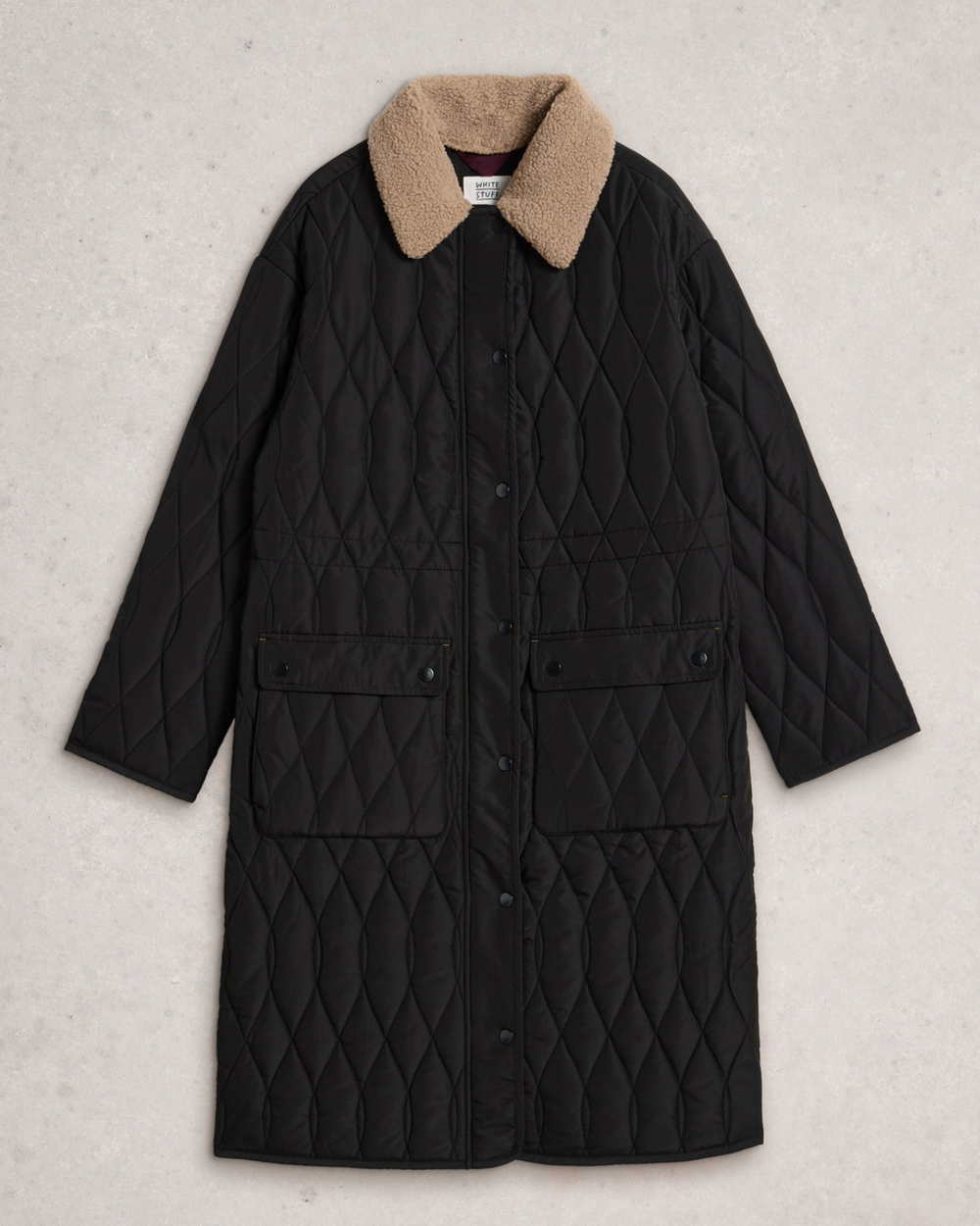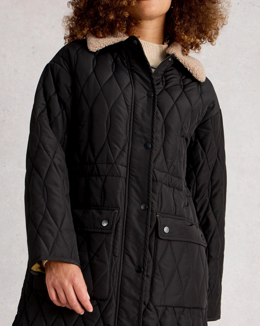 This quilted, rain-resistant coat features a drawstring waist to adjust the fit. Midi length.