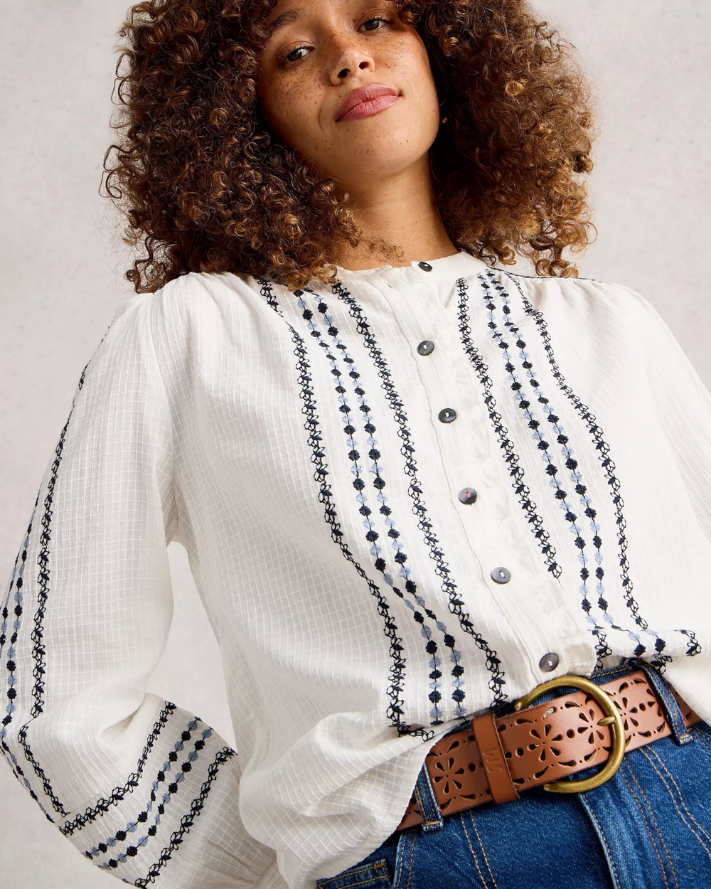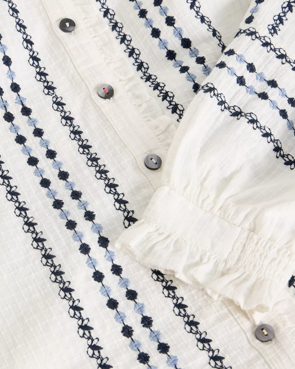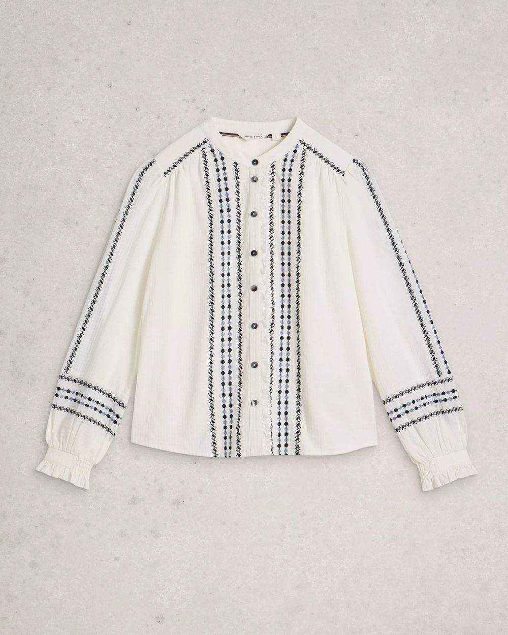 Ivory blouse with navy embroidery. Round neckline and lace details at the cuffs.