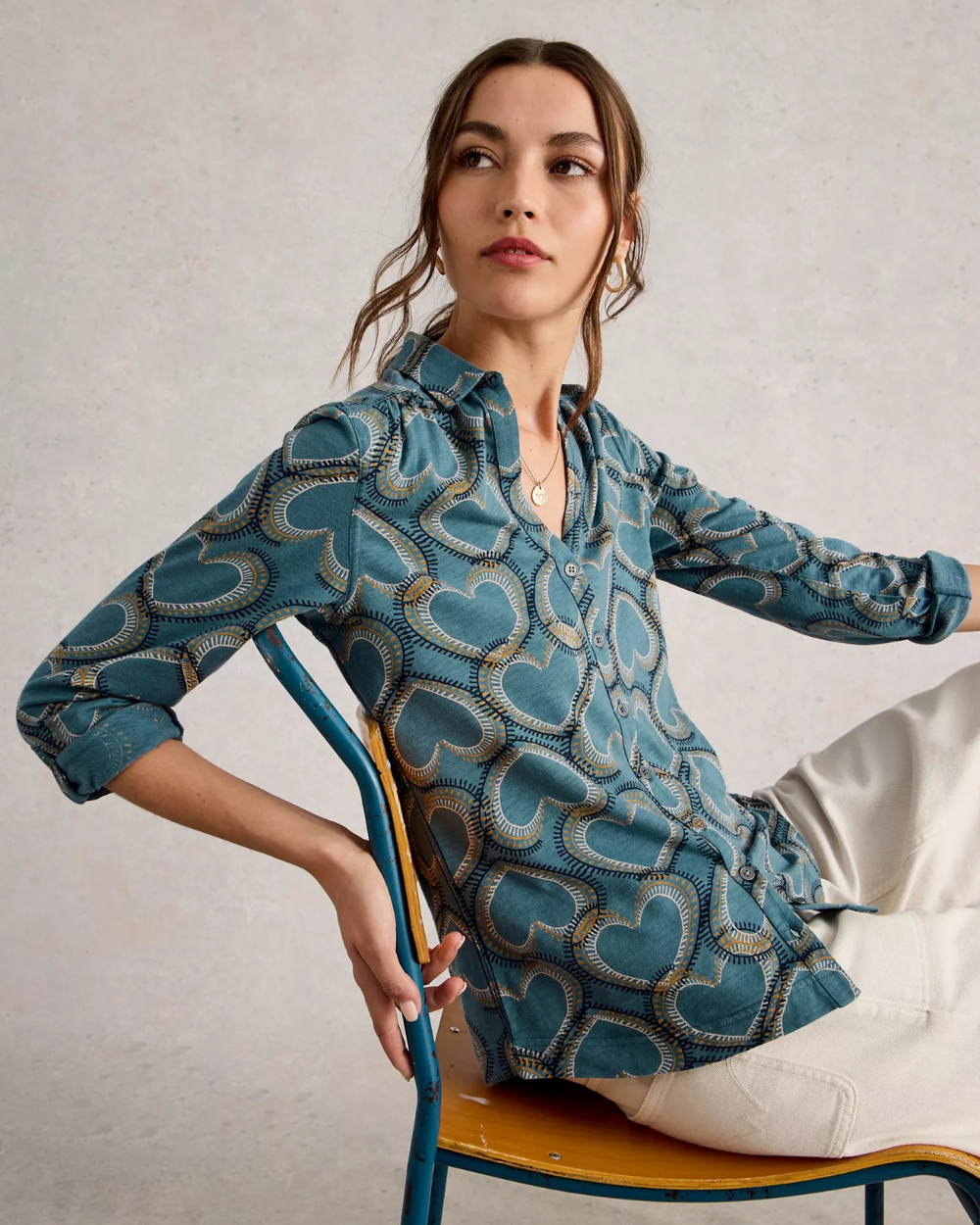 Printed button up v-neck shirt with collar