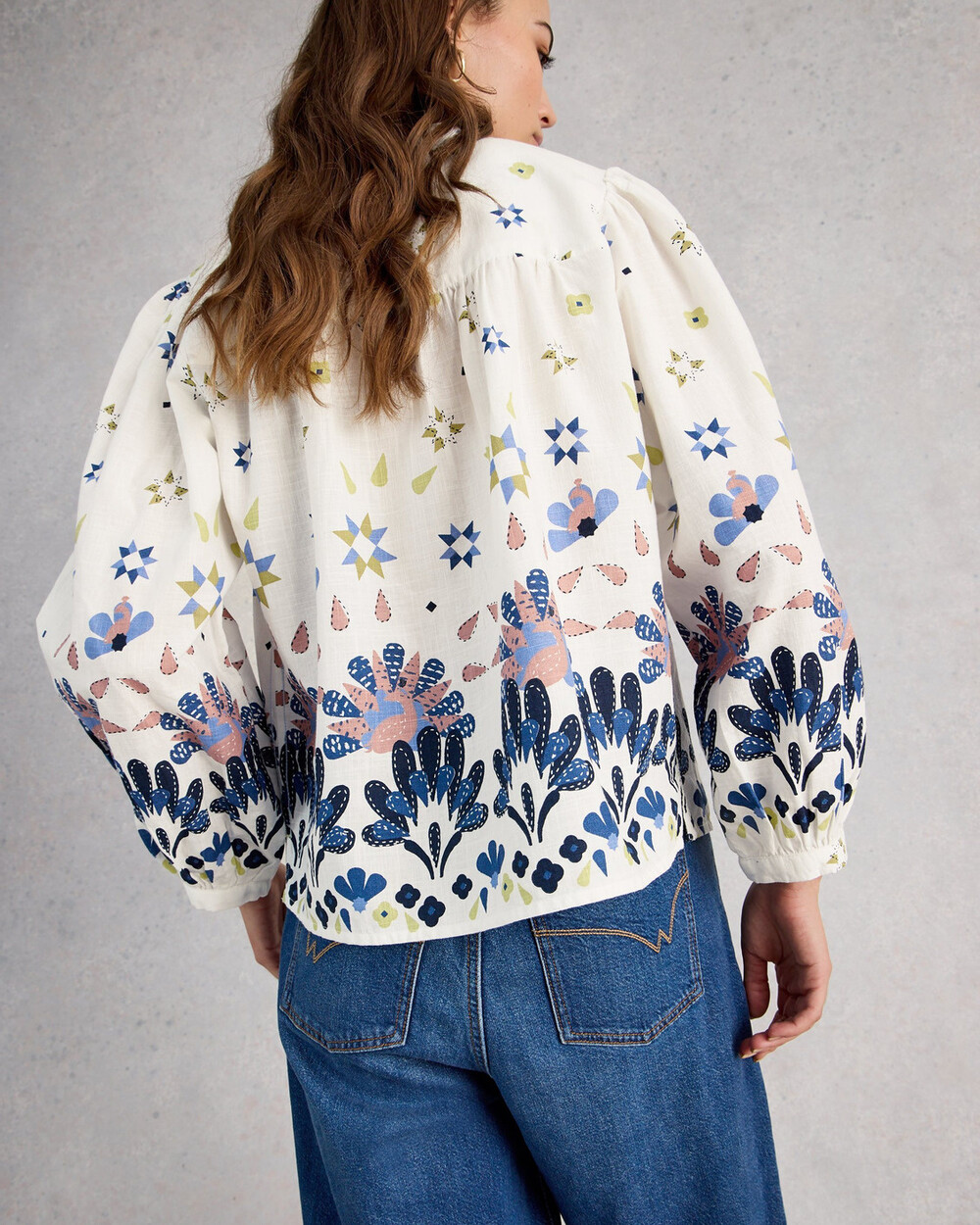Crew neck button up printed cotton blouse with balloon sleeve. White Stuff exclusive print.