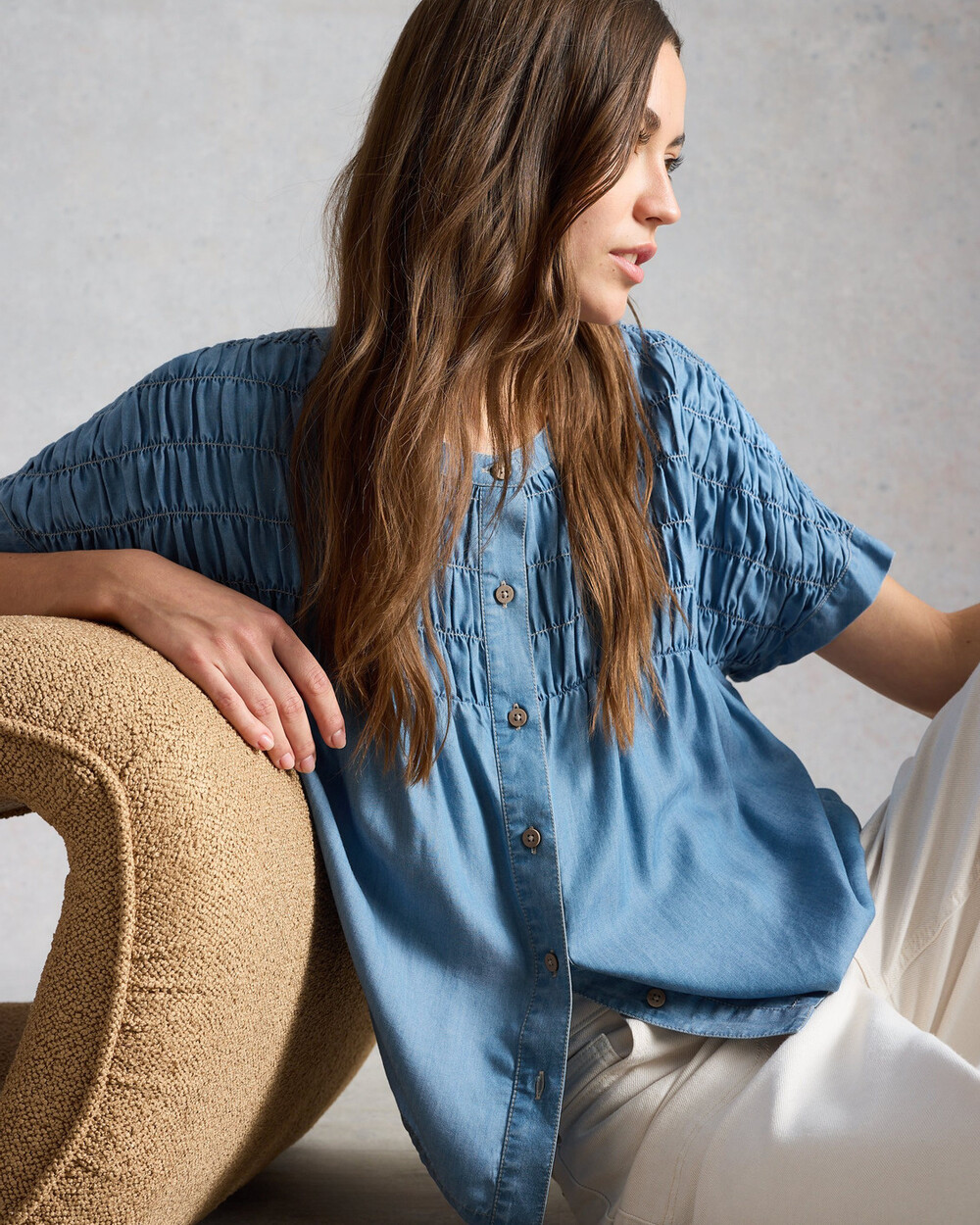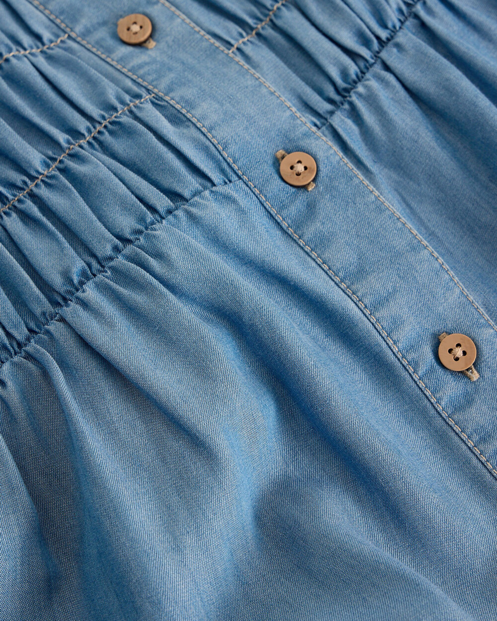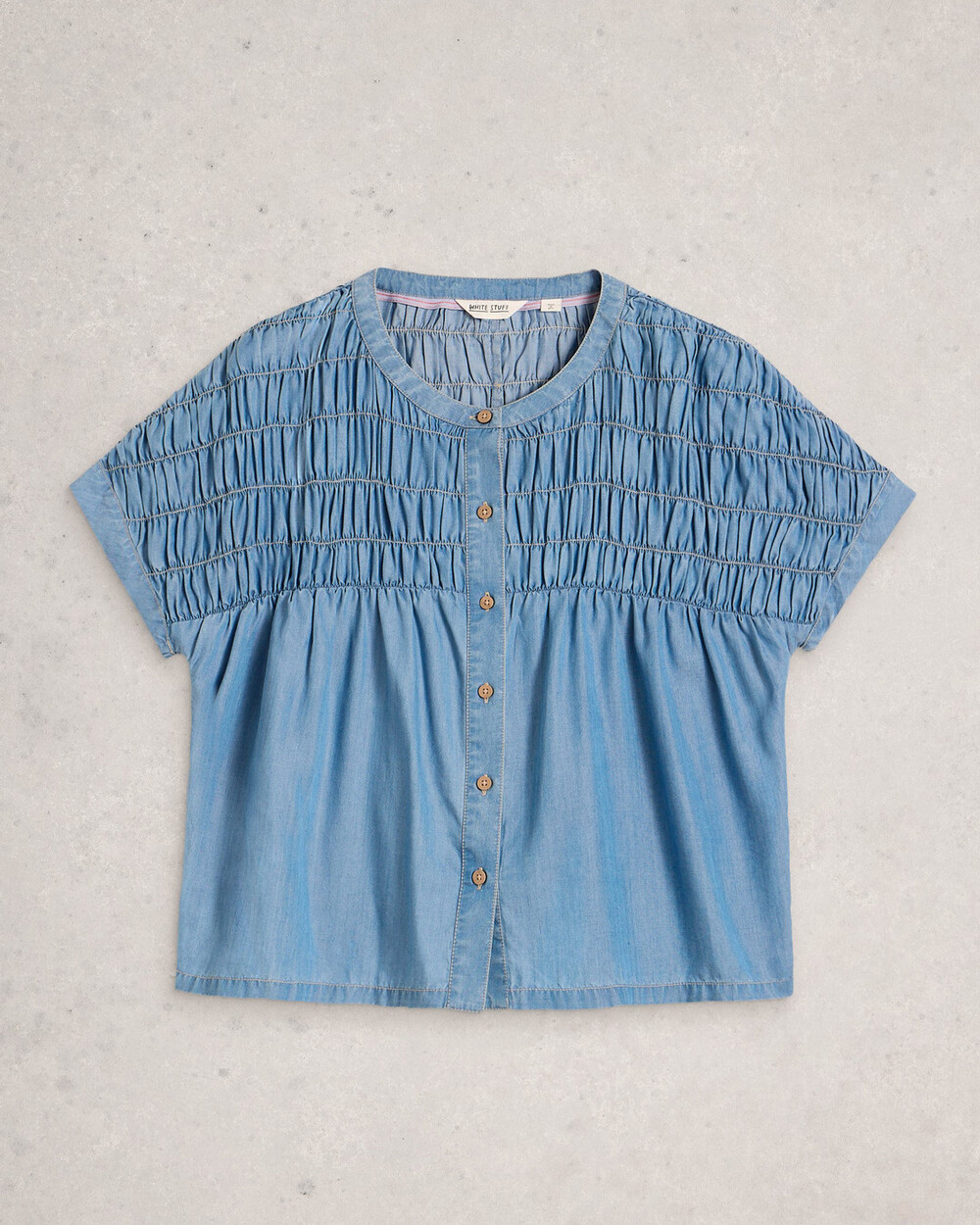 Crew neck button down short sleeve chambray shirt with rushed treatment.