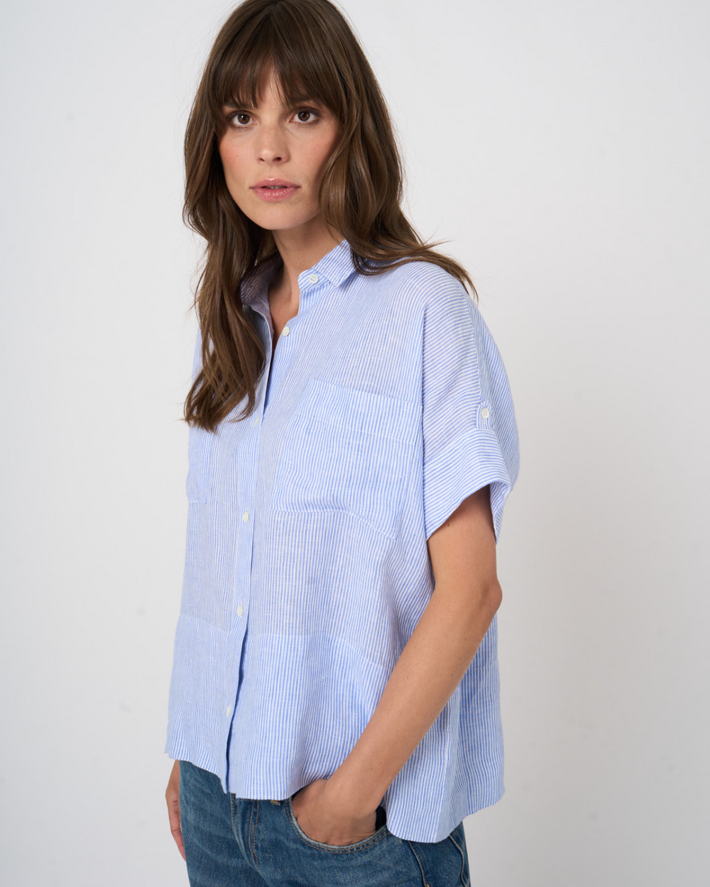 Drop shoulder short sleeve shirt with patch pockets and doubled hem