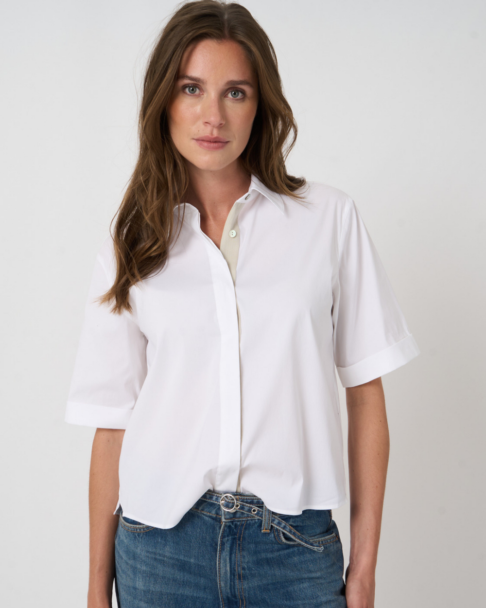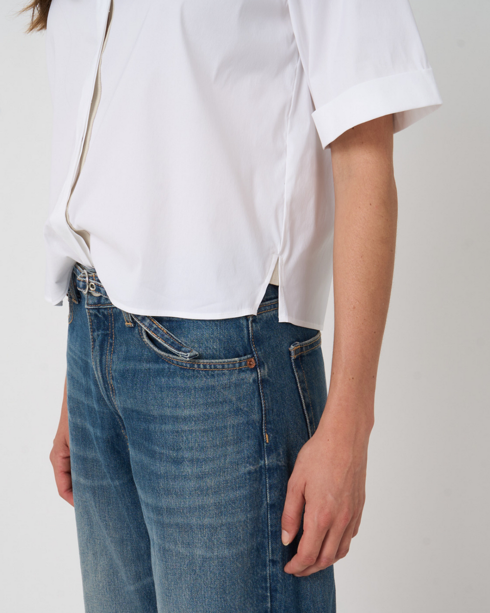 Short sleeve button front shirt with contrast ribbon trim split side detail