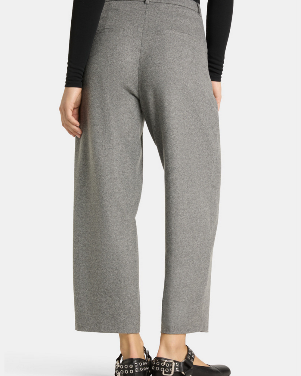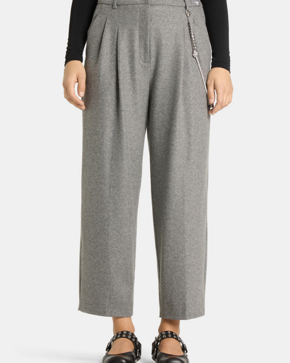 Lightweight flannel pant with double drop pleats and large detachable Swarovski crystal chain