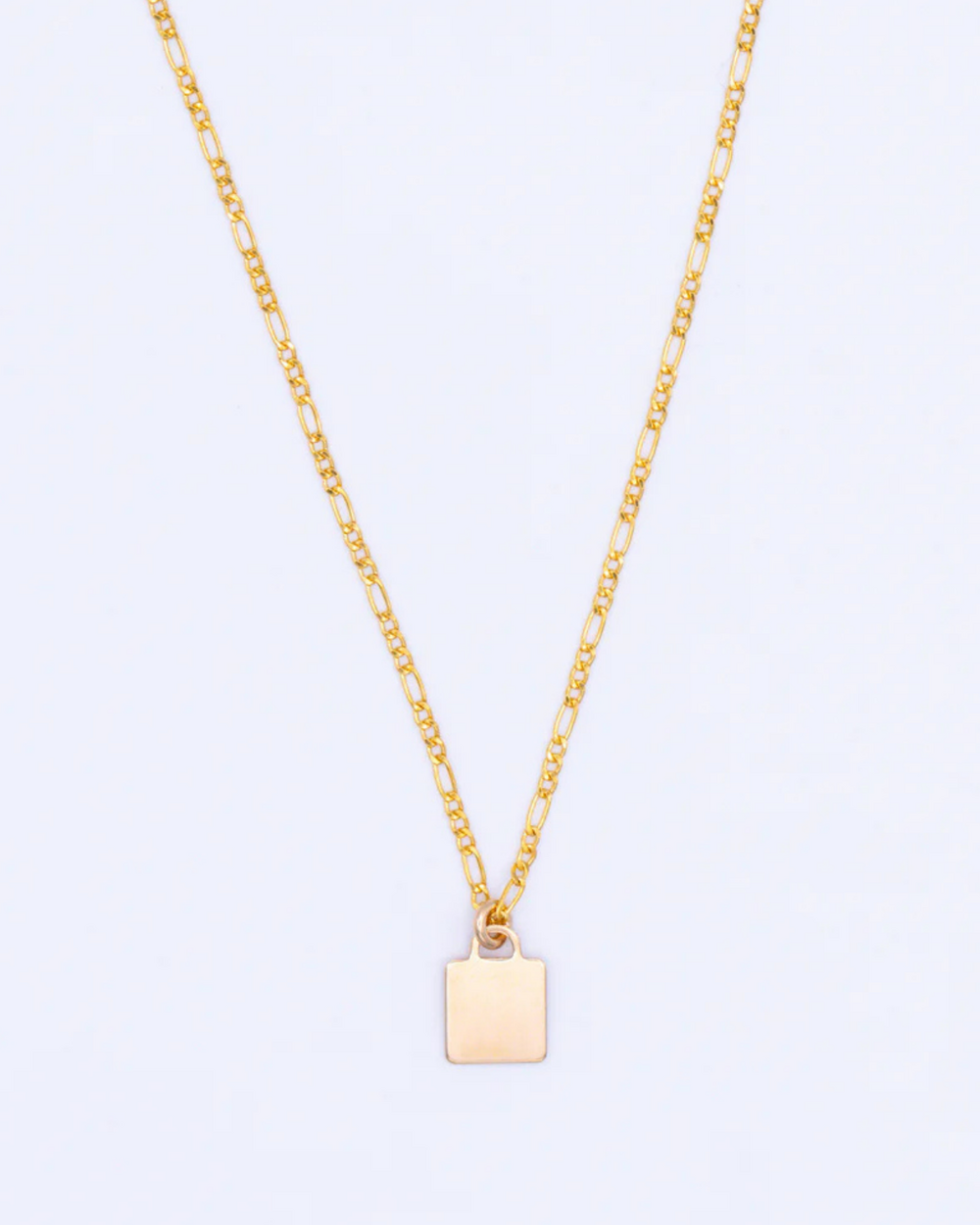 16" gold-filled figaro chain necklace with small square pendant. With 2.5" extender.