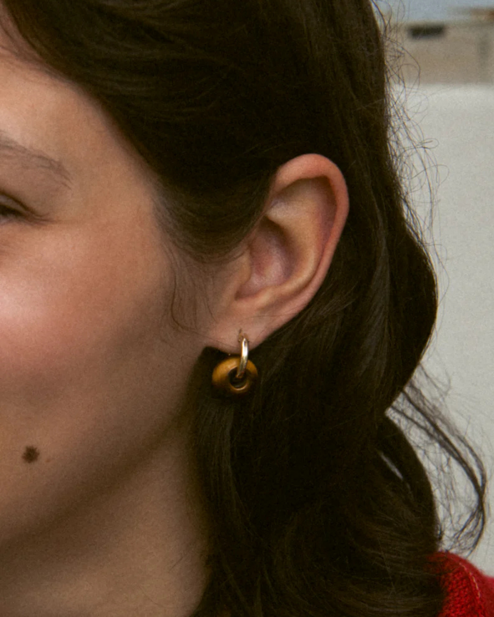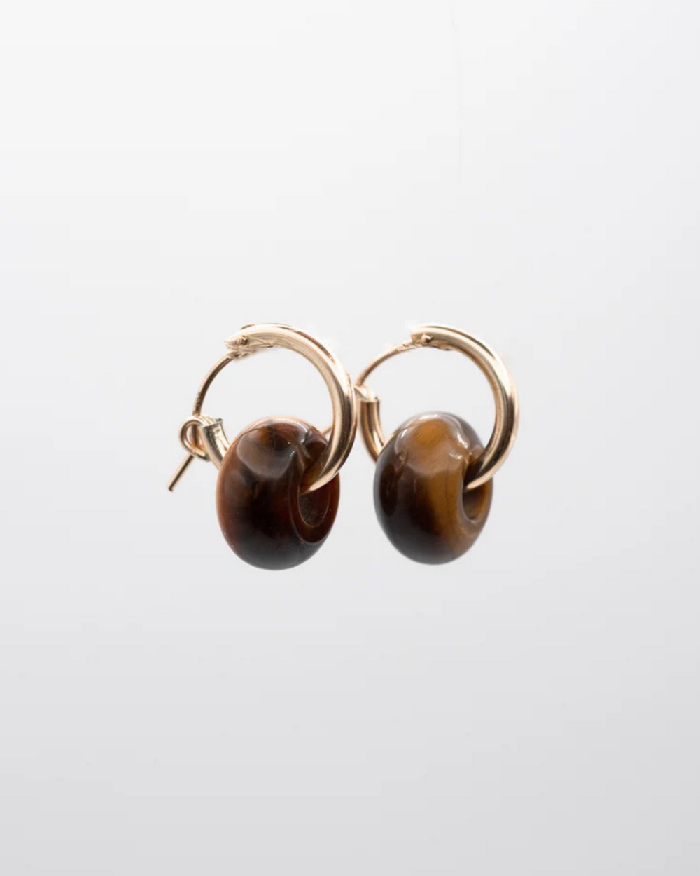 15mm gold-filled hoop earrings with 14 x 8mm tiger's eye roundels.