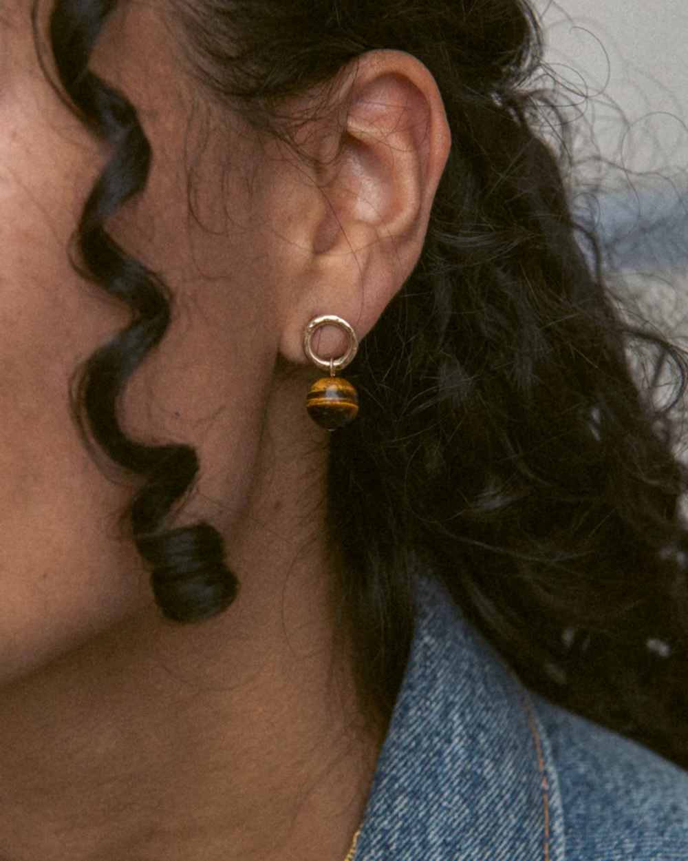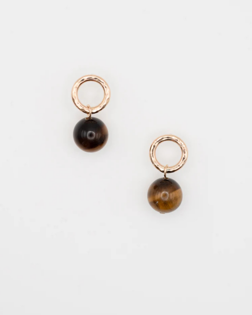 Gold-fill post earrings with 11mm closed hoop and 10mm tiger's eye stone.