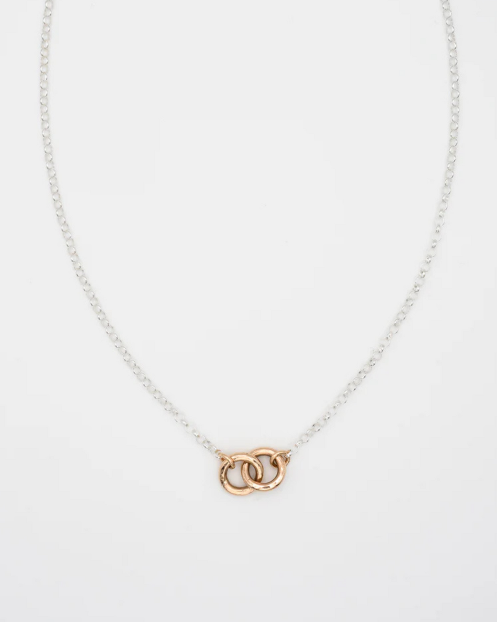 16" sterling silver rolo chain necklace with interlocked loops in gold-filled. With 2.5" extender.