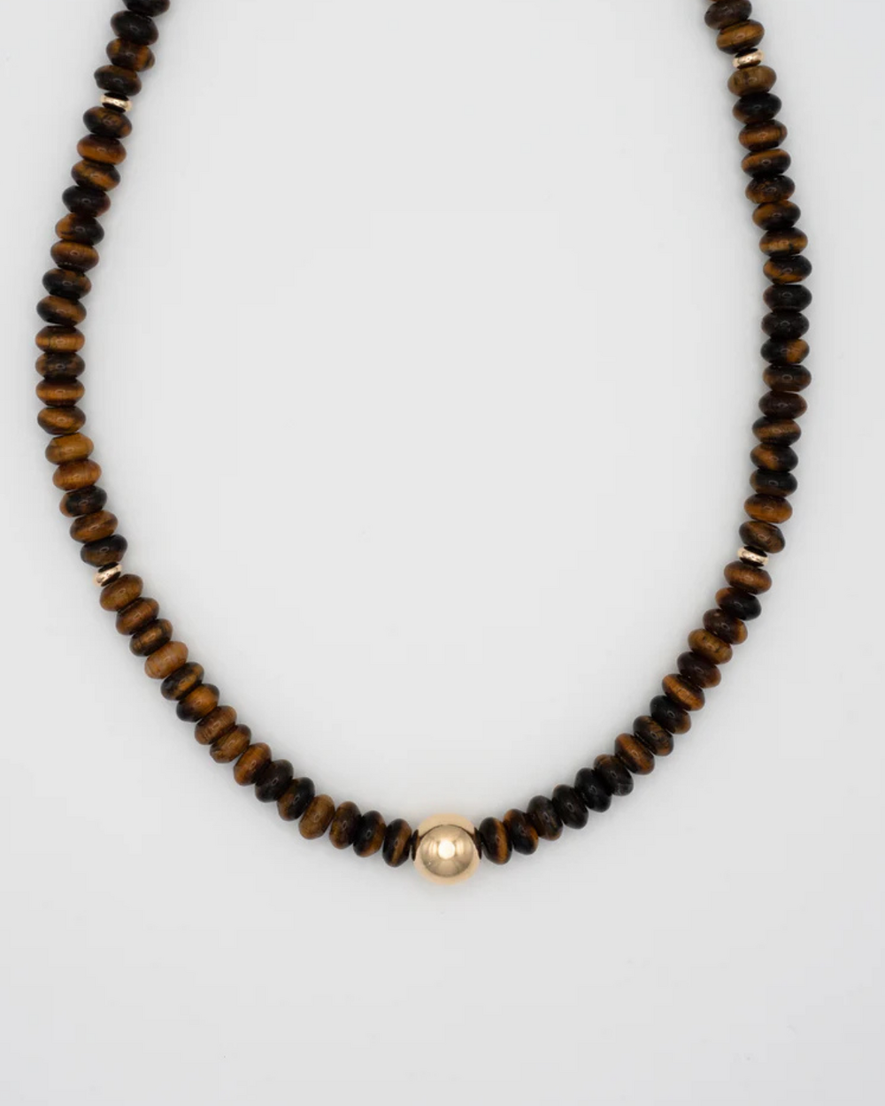 16" necklace with tiger's eye roundels, central gold-filled ball.