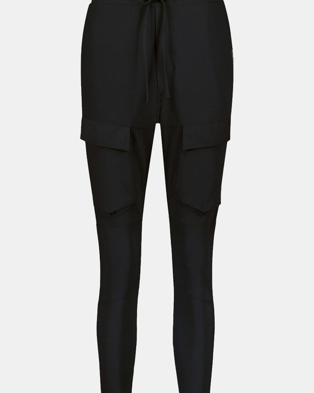 Slim leg pull on lightweight trouser with cargo packets on mid thigh, and elastic wasitband and tie at front