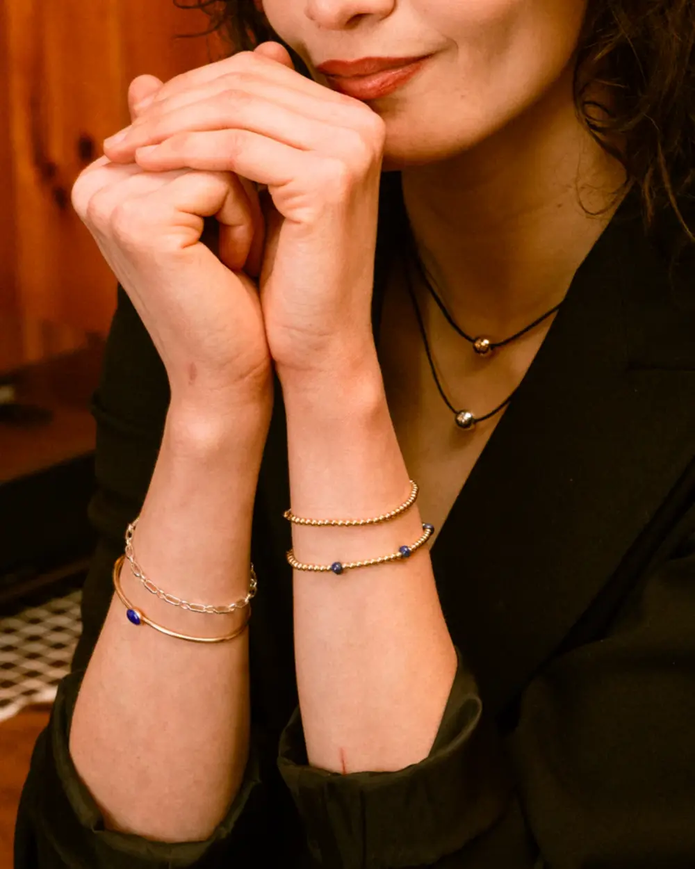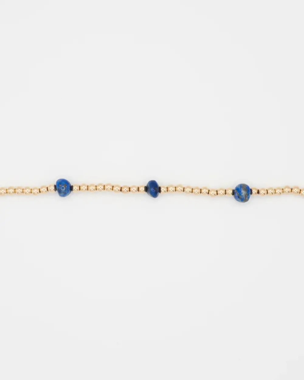 Ferie 6" bracelet with 3mm gold-filled beads and 3 lapis lazuli stones.