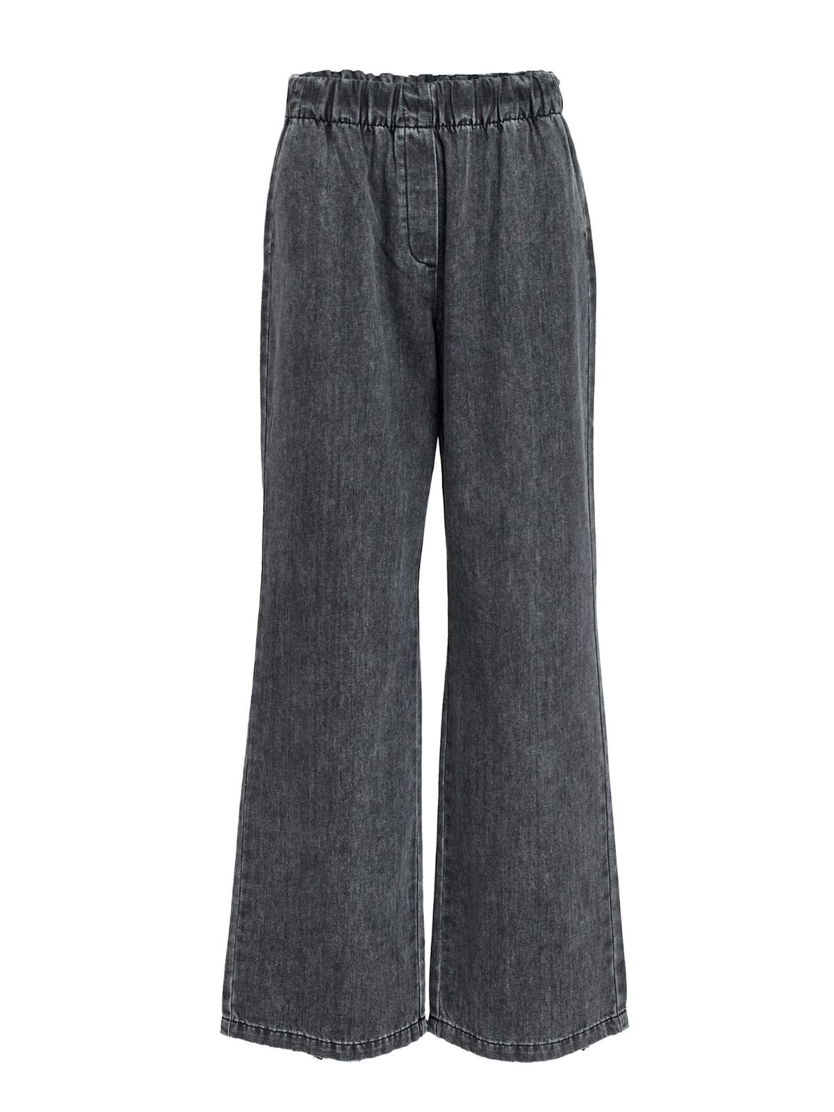 Wide leg stretchy pair of denim with a mid rise, side pockets and an elastic waist band.
