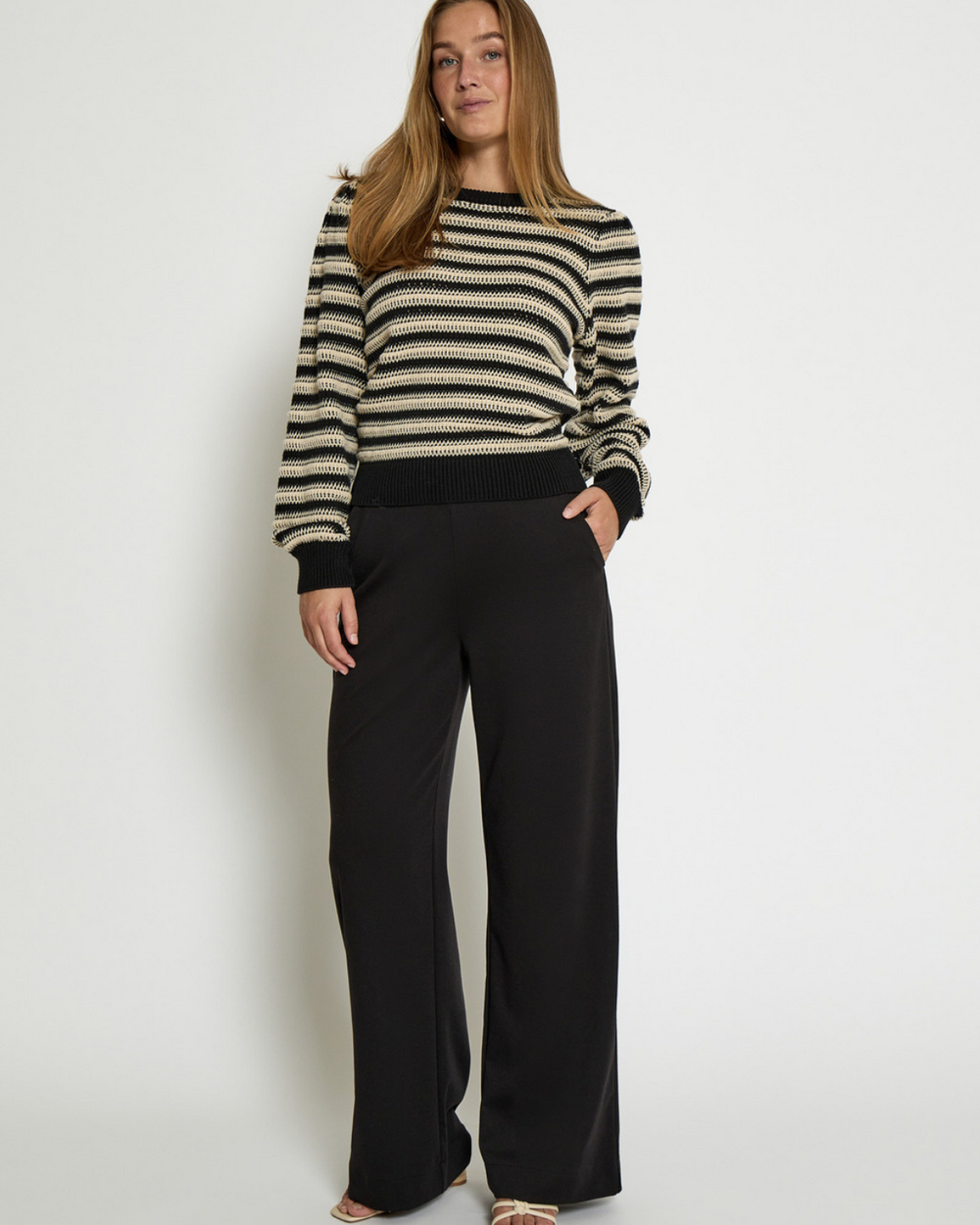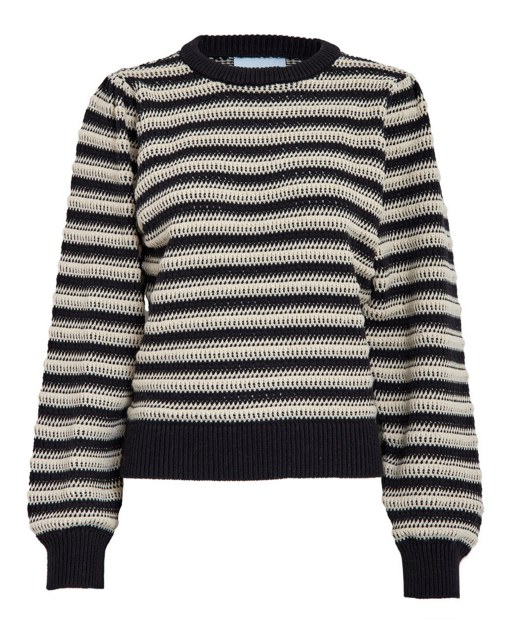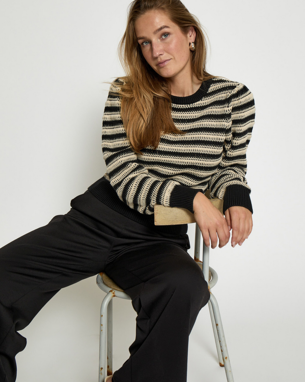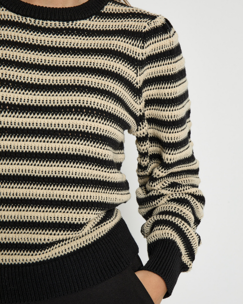 Classic fit striped crew neck knit with a see through pattern and contrasted rib details at the neckline, hem and cuffs.