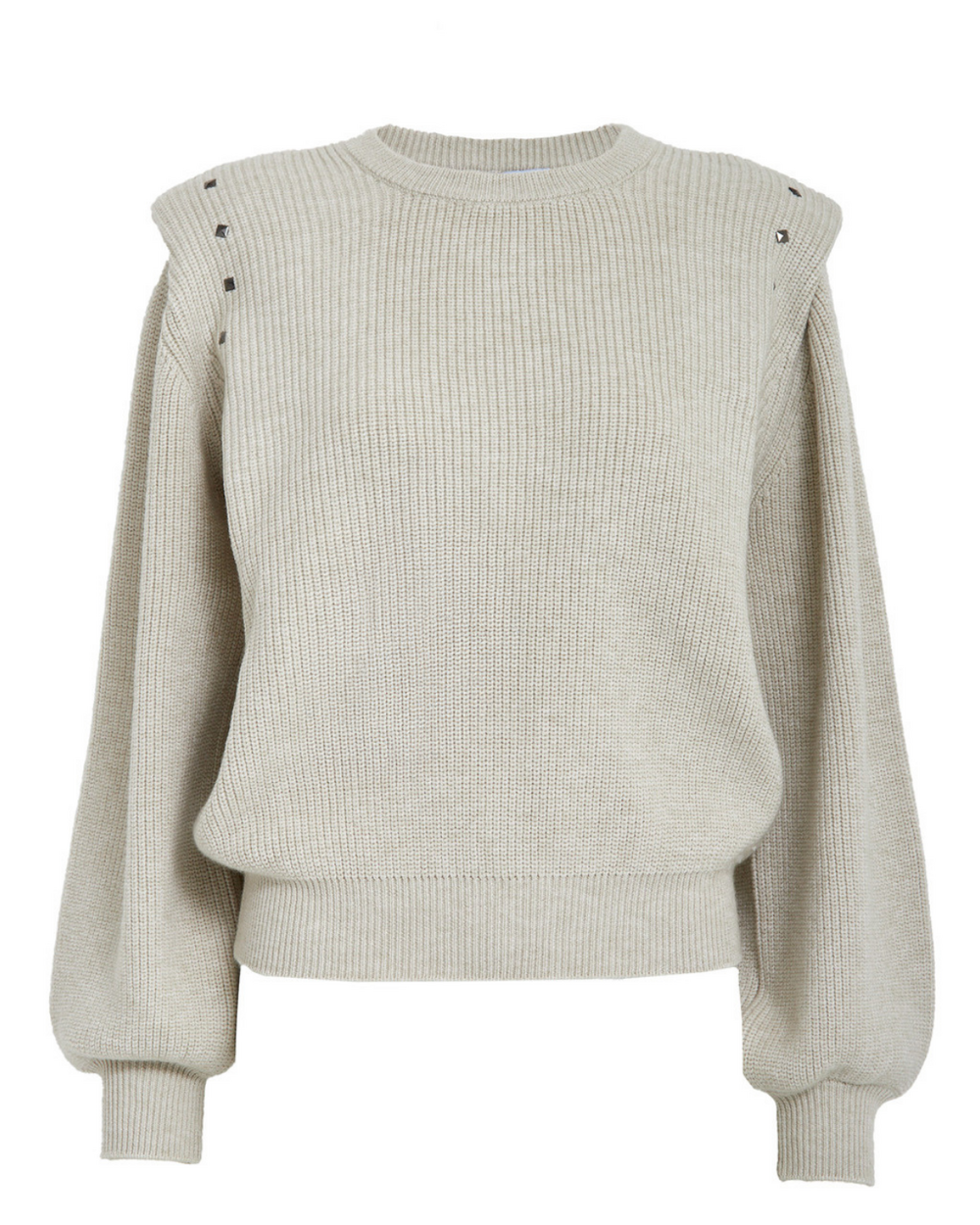 Relaxed fit crew neck wool blend knit with shoulder pads and studded ornaments at the shoulder seam.
