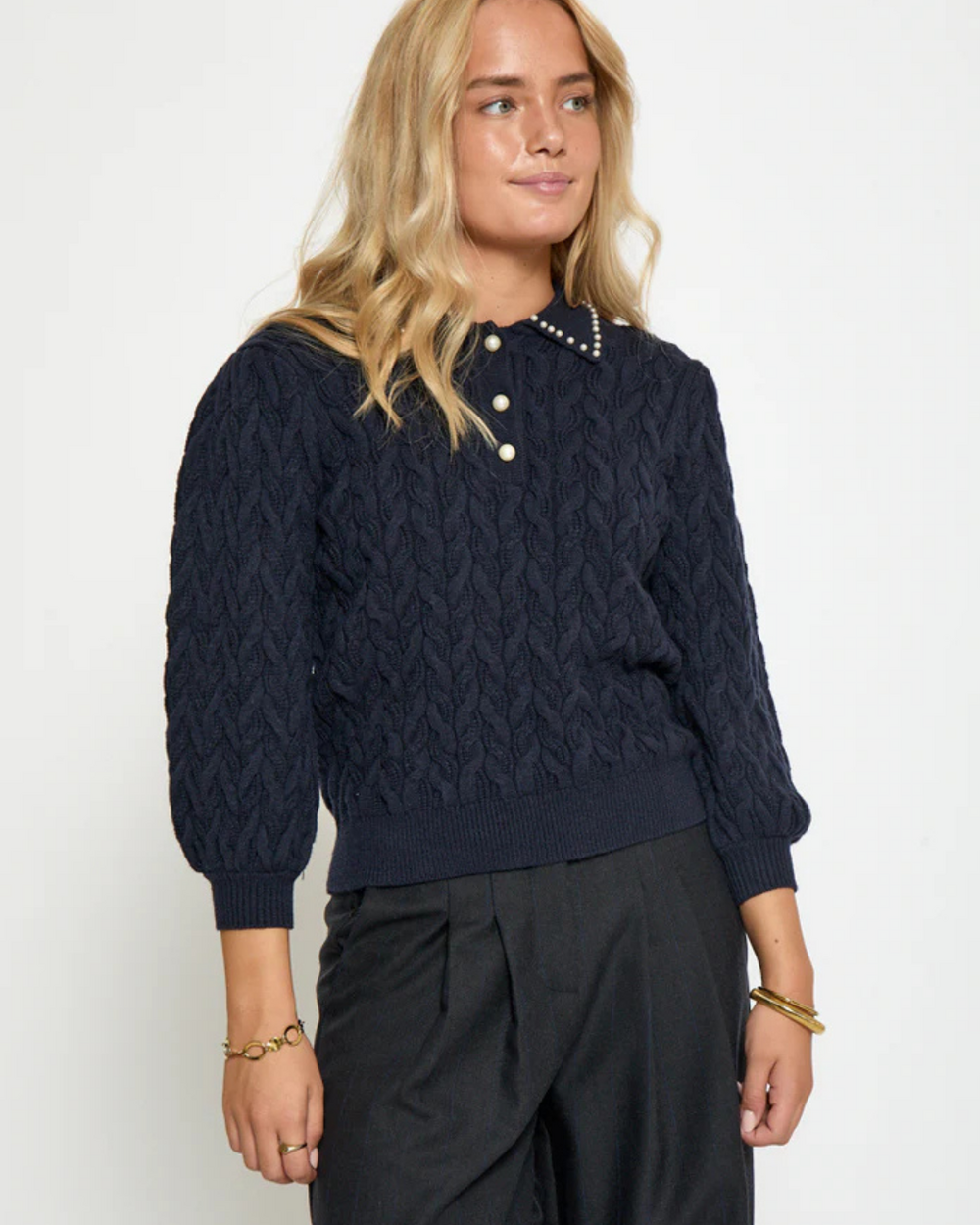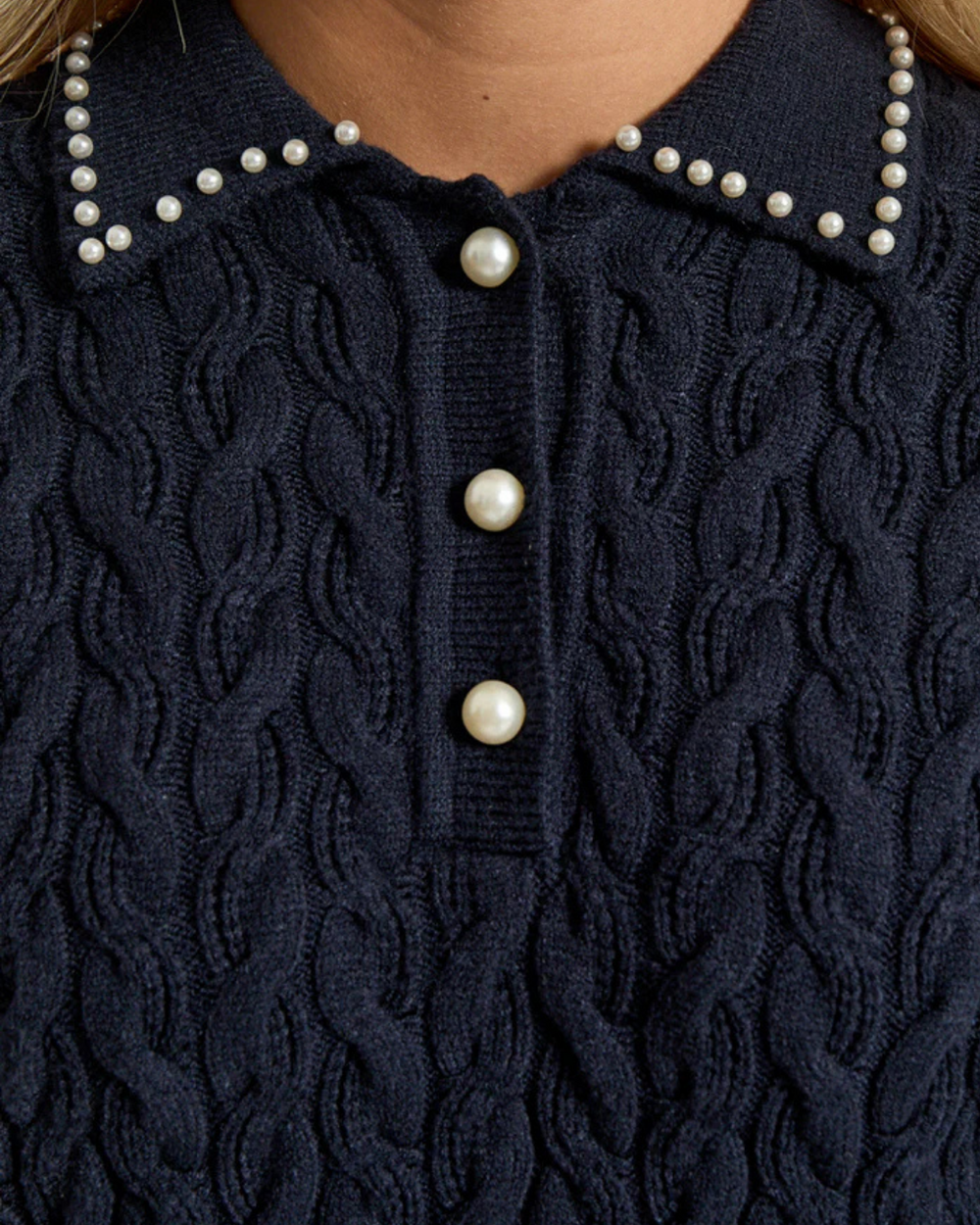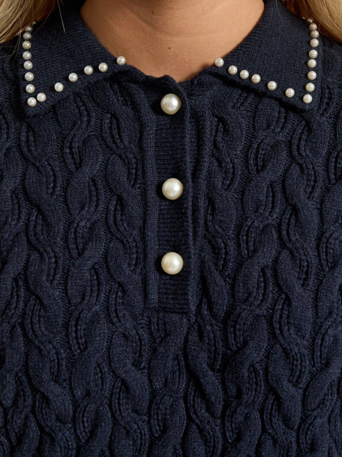 Slim fit viscose blend sweater with chunky cable knit detailing and three quarter sleeves, finished with pearl embellishment at the collar.