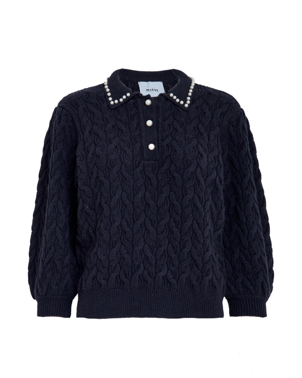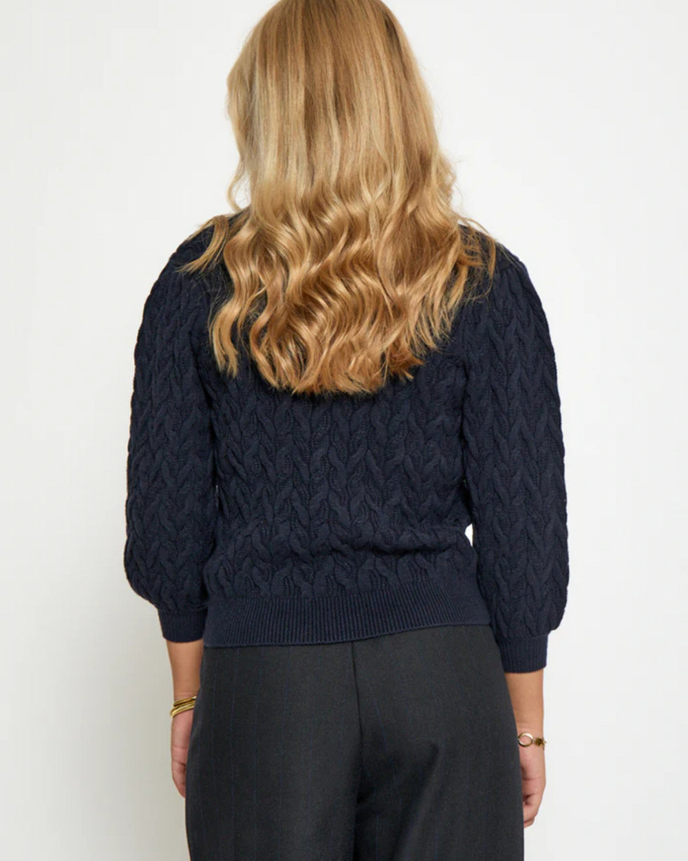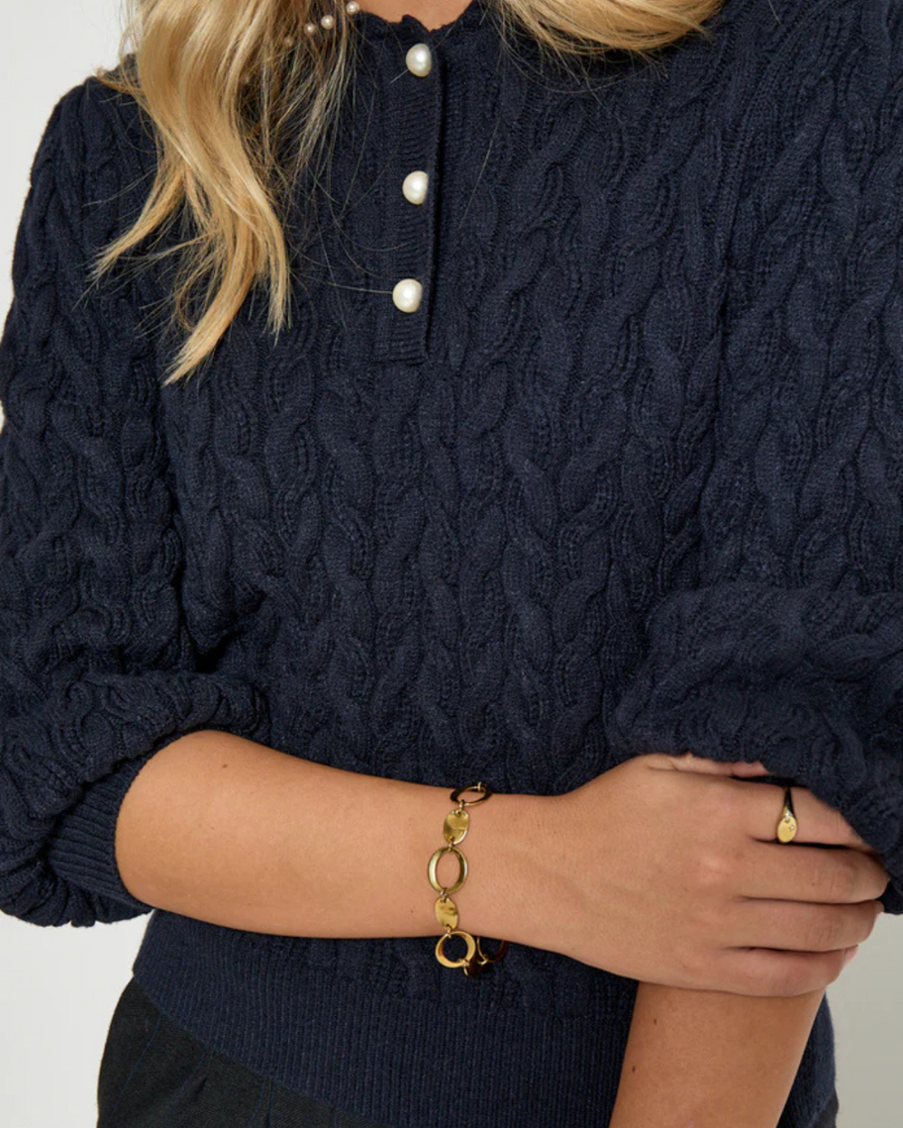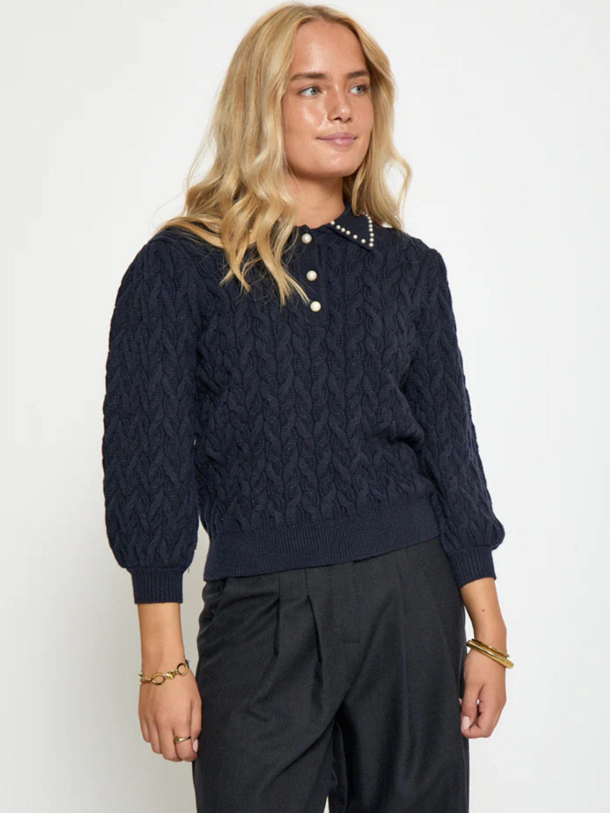 Slim fit viscose blend sweater with chunky cable knit detailing and three quarter sleeves, finished with pearl embellishment at the collar.