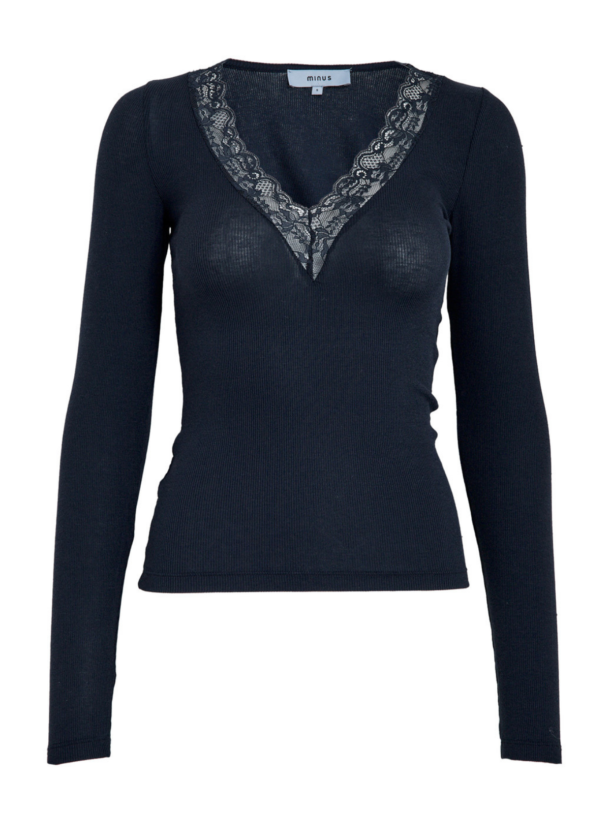 Tight fitted longsleeve rib shirt with tone-on-tone lace detail at the neckline.