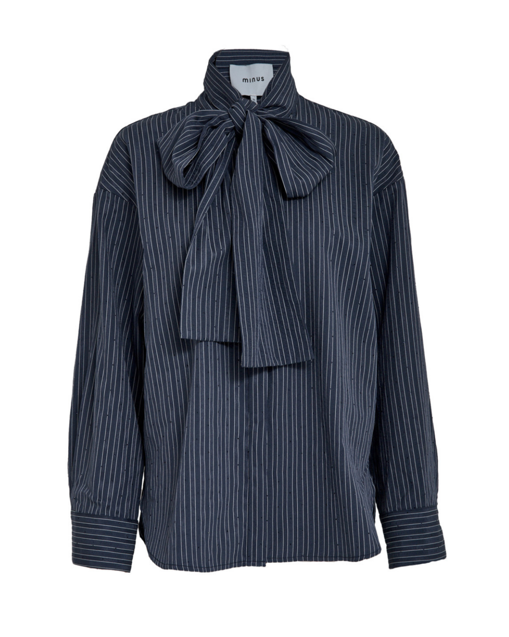 Oversized striped longlseeve shirt with bow detail at the collar.